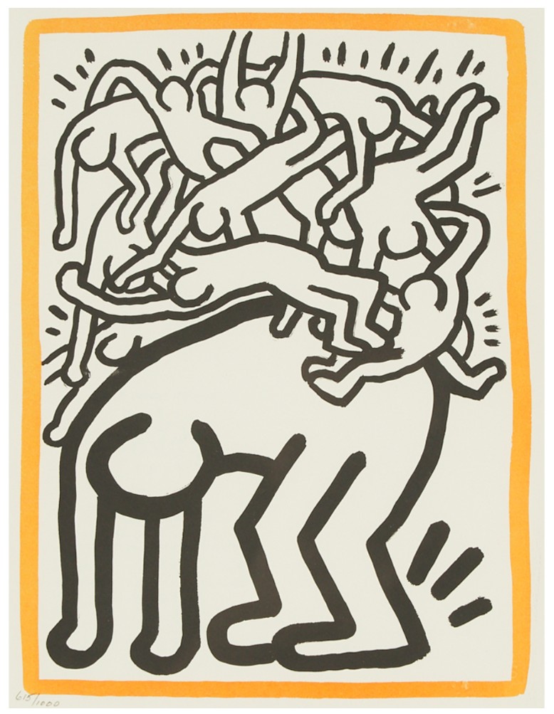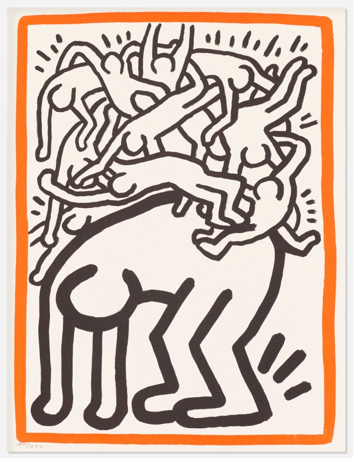 With its stark imagery, the lithograph portrays a colossal, gender-neutral figure, burdened and bowed under the weight of numerous smaller figures piled on top. This central imagery, captured in Haring’s signature bold lines, symbolizes those marginalized and tormented by AIDS, seemingly abandoned by society and confined within the bounds of the artwork. Accentuated by emanating lines, Haring introduces an element of urgency and kinetic energy, emphasizing the pressing need for action and understanding. Furthermore, it is enveloped in a vibrant, hand-drawn red rectangle.