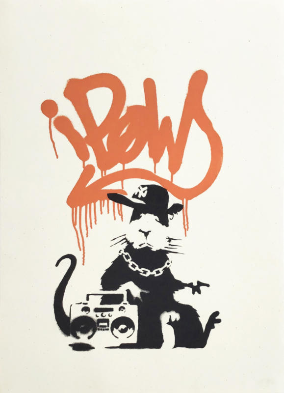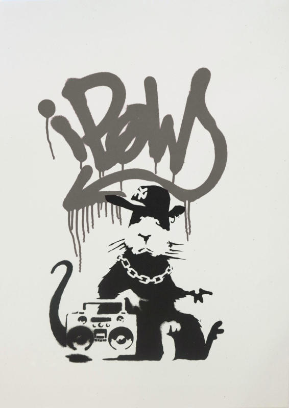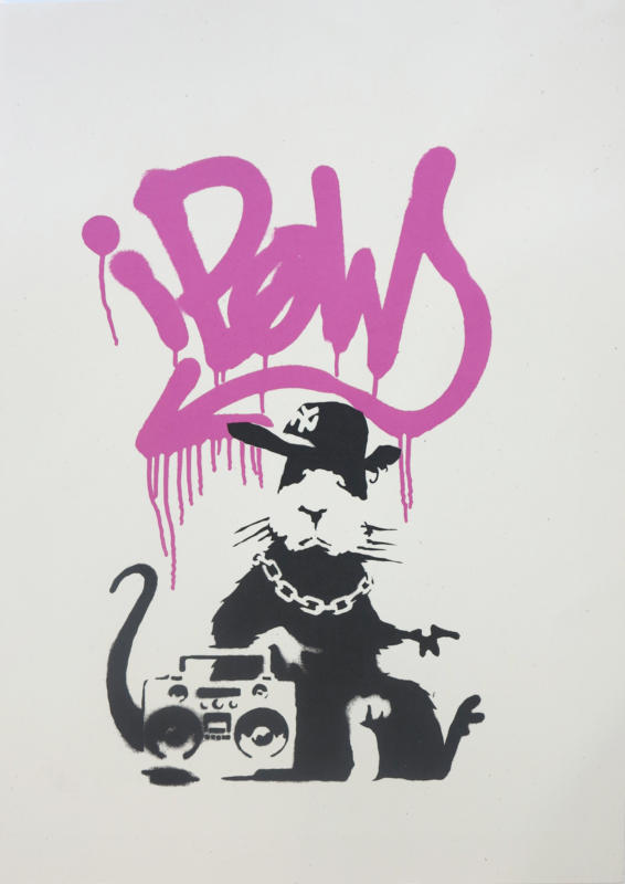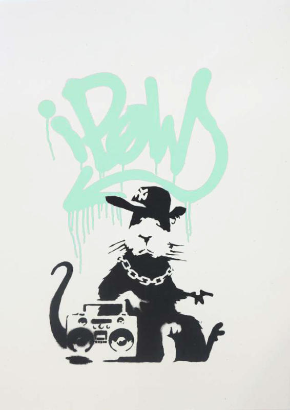 Gangsta Rat combines spray-paint and black and white stenciling techniques. It depicts a black and white rat wearing a New York Mets baseball cap, a chain necklace, and carrying a ghetto blaster. The character portrayed is reminiscent of the New York underground style that was prevalent across the UK in the 1980s and 90s. Gangsta Rat appears to have tagged “iPow” on the wall behind him in spray paint. The image is an ironic social commentary on the ubiquity of Apple products, whereas POW is a clear reference to Banksy’s print publisher: Pictures on Walls.
