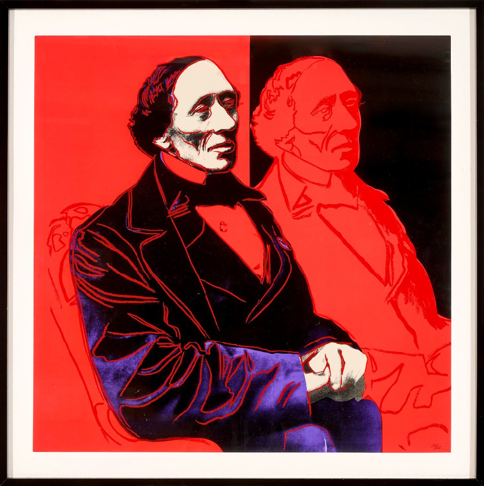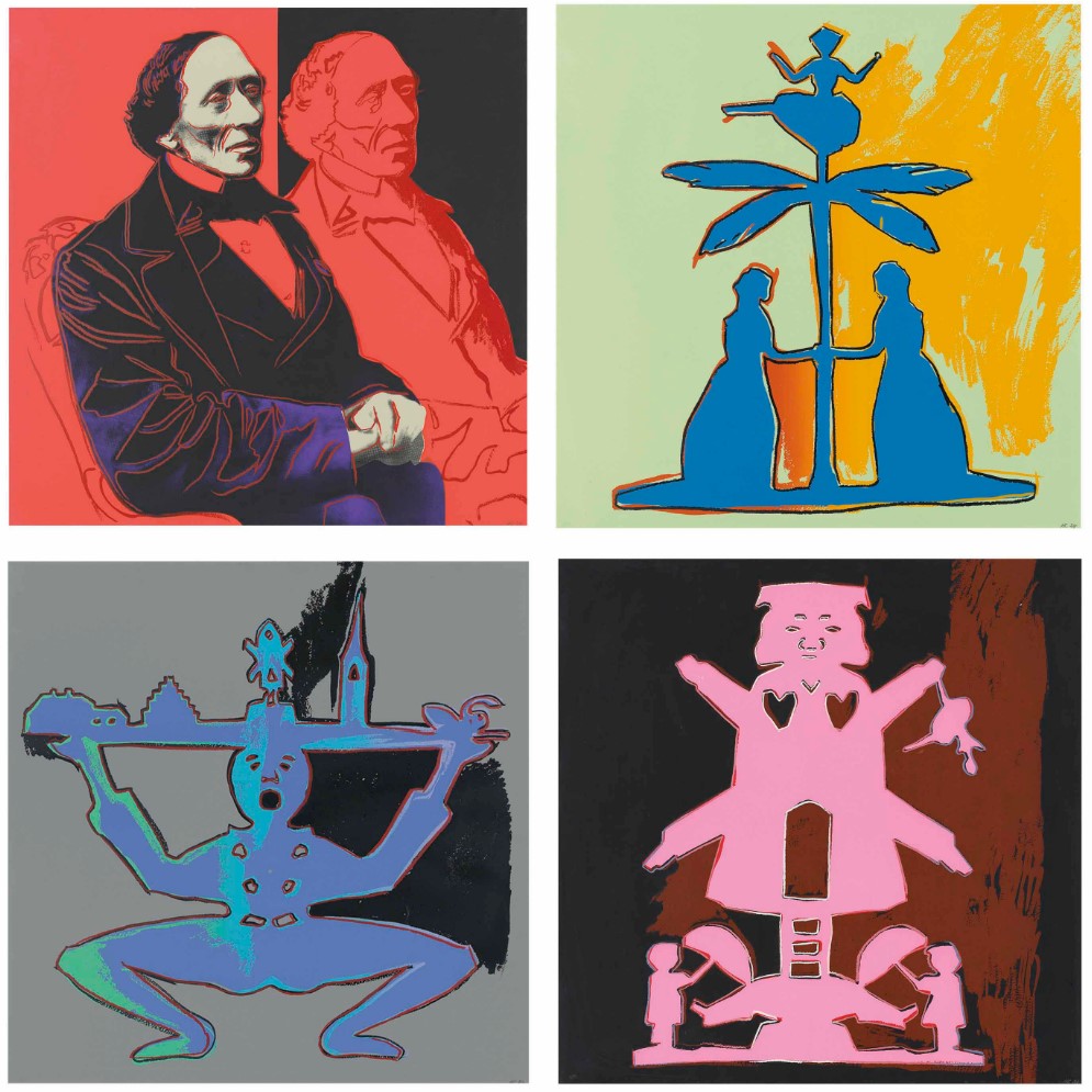 Andy Warhol created two series of four screen prints dedicated to Hans Christian Andersen. The series was conceived a year prior to his death, therefore it is possible the artist began reflecting on his own childhood during this time. Once again, the pop artist used pre-existing images, in this case the work of another artist, enlarged them manifold and gave them his signature color treatment, rather than creating his own interpretation of the author’s figures and tales.