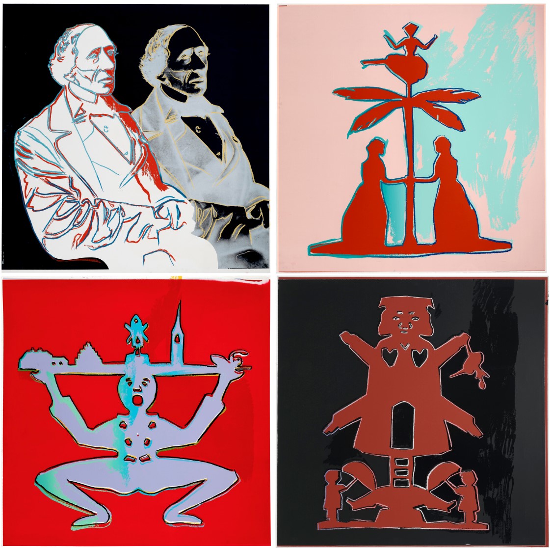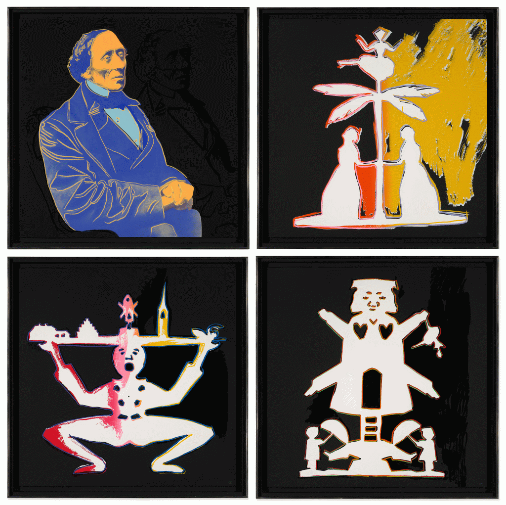 Andy Warhol created two series of four screen prints dedicated to Hans Christian Andersen. The series was conceived a year prior to his death, therefore it is possible the artist began reflecting on his own childhood during this time. Once again, the pop artist used pre-existing images, in this case the work of another artist, enlarged them manifold and gave them his signature color treatment, rather than creating his own interpretation of the author’s figures and tales. The source-material for the four prints consists of a famous photographic portrait of Andersen in profile, and of three of his paper cut-outs, created between 1865 and 1870: ‘Two Women by a Palm Tree with a Ballerina on Top of it‘, ‘Clown with Tablet on his Head’, ‘Miller with two Ole Lukøjes’.