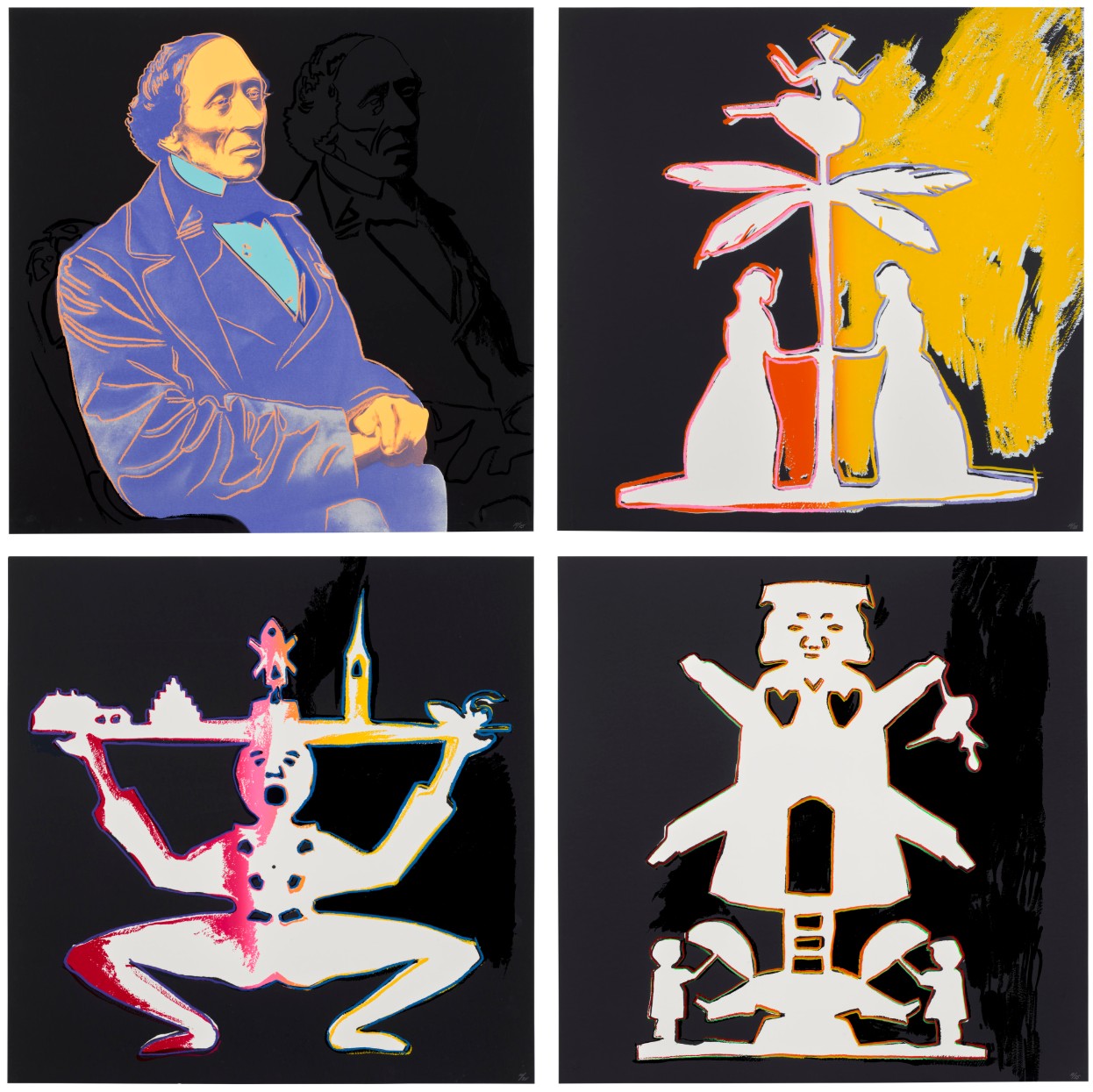 Andersen created around 1000 paper cutouts in his life time, and used to carry scissors with him to create silhouettes for his friends and their children. His paper cutouts are childlike and playful, though not directly representative of his fairytales. Nevertheless, Andersen sometimes featured papercuts alongside his stories as an additional feature. Many believe, like his fairytales, the paper shapes also contain hidden meanings beyond their innocent imagery. Unlike Warhol’s previous works, the screen prints use a minimal color palette. It appears that Warhol depicts Andersen with sincere respect rather than veiled irony. Overall, Warhol pays a sweet tribute to a man who equally valued childlike curiosity and modern thinking.