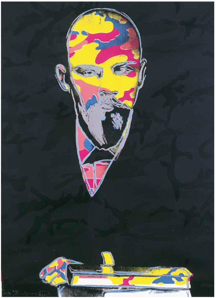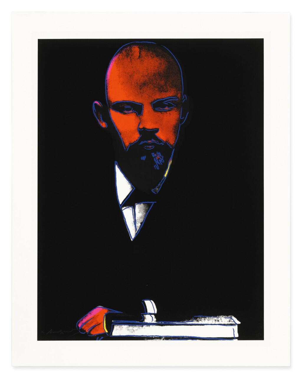 Based on Philipp Schönborn’s photograph of Lenin and successor Joseph Stalin, the Lenin series was printed and published after Warhol’s death in 1987, and formed through a complex development period. Bernd Klüser, who published the works, recalls this germination: ‘Our experiments with the prints over a period of several months had a considerable influence on the eventual look of the series as a whole. The range of colours was reduced, the drawing round the head was modified, and the background became a deep black, as in the original photograph.’