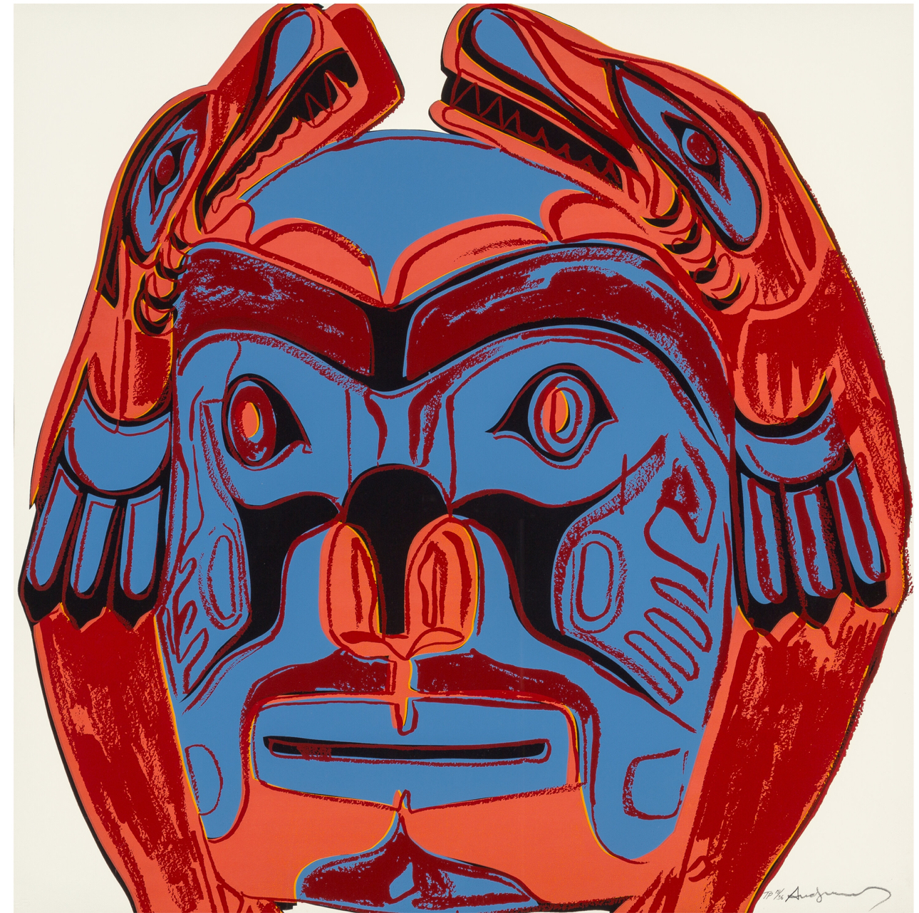 In Northwest Coast Mask, Warhol employs his signature screenprinting technique to reimagine the traditional mask through a pop art lens. The composition presents the mask frontally, emphasizing its symmetrical design and intricate details. Warhol utilizes a vivid color palette, with bold reds, blues, and yellows set against a stark white background. This choice of colors not only highlights the mask’s features but also aligns with Warhol’s tendency to use striking hues to captivate the viewer’s attention. By isolating the mask from its original context and rendering it in a pop art style, Warhol invites viewers to reconsider the ways in which Indigenous art is perceived and consumed in popular culture.