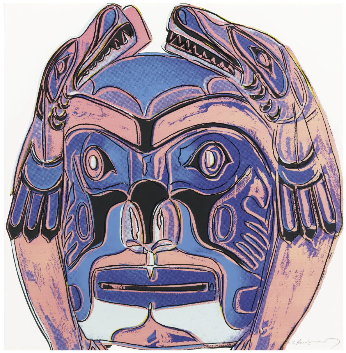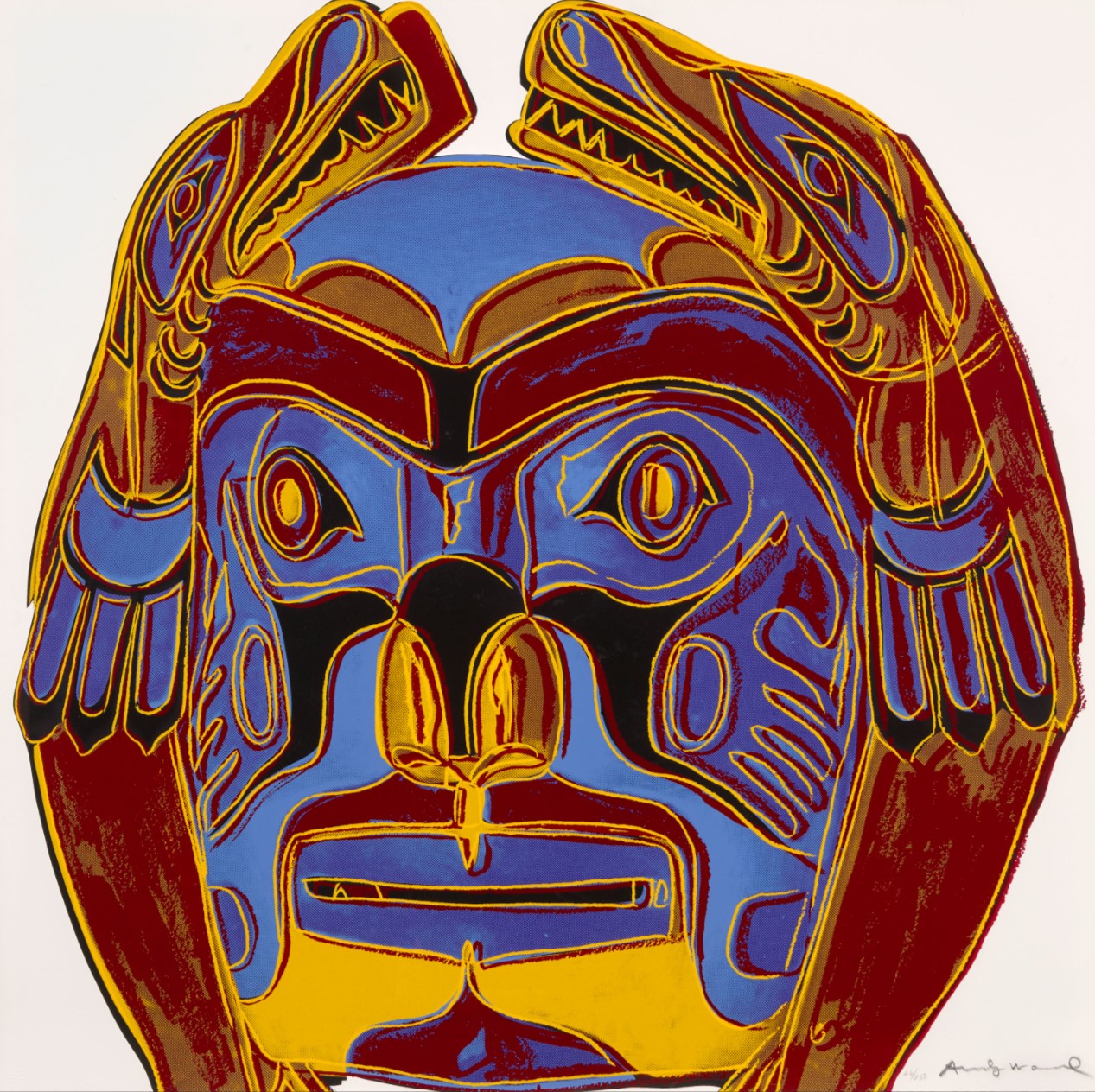 In 1986, Andy Warhol expanded his exploration of American cultural icons with the Cowboys and Indians series, a collection that juxtaposes figures and artifacts emblematic of the American West. Among these works is Northwest Coast Mask, a screenprint that delves into the rich artistic traditions of Indigenous peoples from the Pacific Northwest. The mask depicted in Warhol’s print is inspired by ceremonial artifacts created by Indigenous communities such as the Kwakwaka’wakw (Kwakiutl) people of the Pacific Northwest Coast. These masks often represent supernatural beings, animals, or ancestral spirits and play a central role in potlatch ceremonies and other cultural rituals. Specifically, the mask in Warhol’s work features the image of Sisiutl, a two-headed sea serpent revered as a powerful guardian and symbol of transformation.