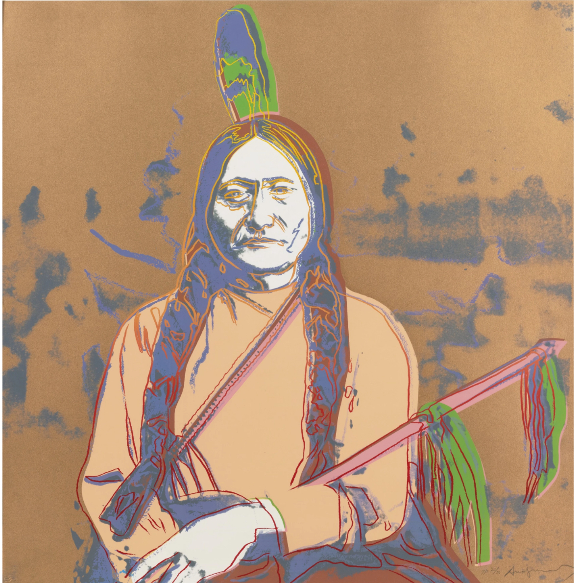 Sitting Bull is based on an archival picture of Sitting Bull, who was the Chief of the Lakota Sioux. This print is Warhol’s homage to the Indian leader, whose resistance against the violation of sovereignty by the white settlers mounted an overwhelmingly successful defense at the Battle of Little Bighorn in 1876.