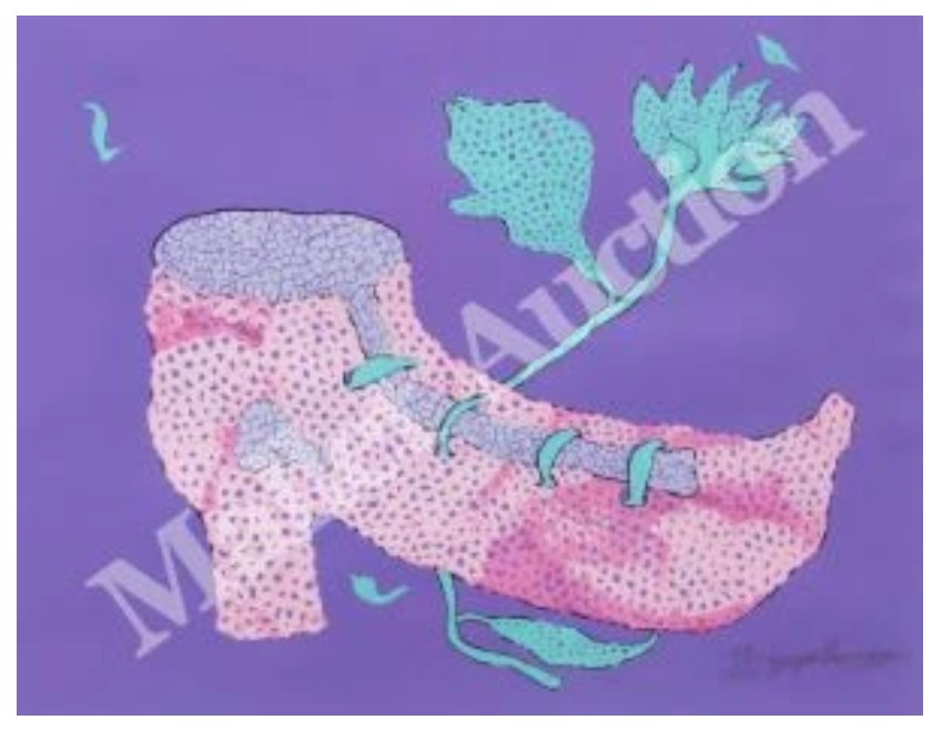 Going to the Field with Shoes On is a seminal screenprint by Yayoi Kusama, marking her official entry into the medium of printmaking after returning to Japan. It features high-heeled shoes as the central motif, a recurring subject in Kusama’s oeuvre. The shoes are embedded with a net-like depiction, characteristic of her famous “Infinity Nets” style. True to Kusama’s aesthetic, the piece utilizes repetition and rhythmic patterns, often polka dots, to cover the surface of the shoes, creating a sense of hypnotic movement.