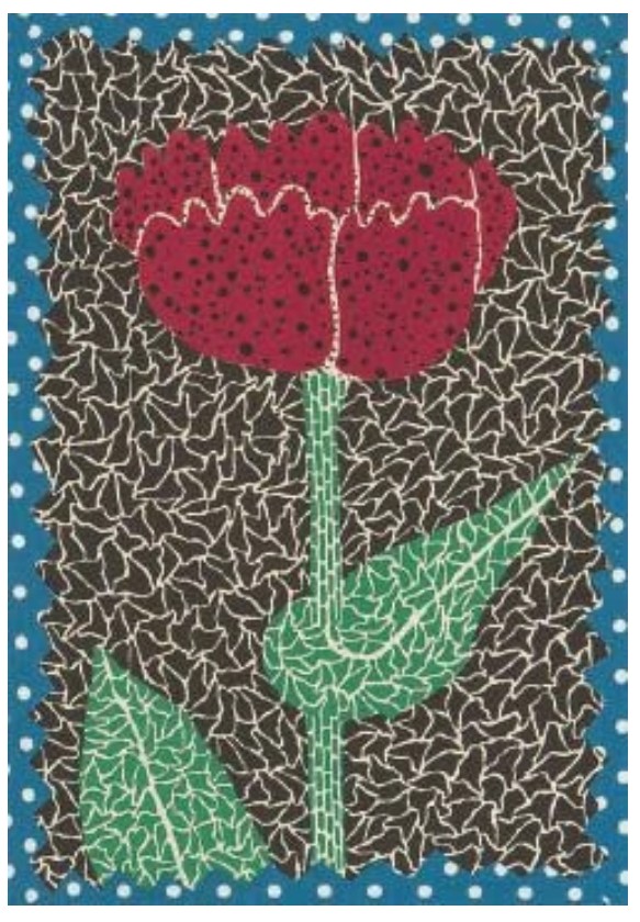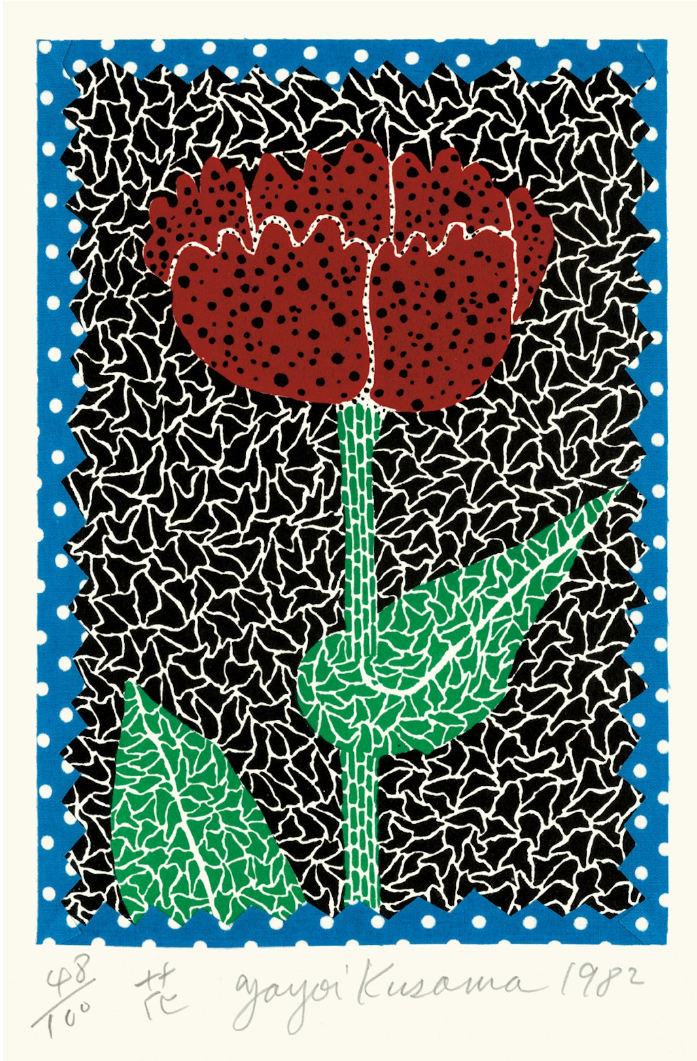 The use of color is economical and deliberate. Red and green, complementary and symbolic, anchor the central motif in natural imagery, while the black-and-white background denies any illusion of depth. The blue polka-dotted border functions as a conceptual frame rather than a decorative one, reinforcing Kusama’s insistence on containment, repetition, and visual order. Produced in the early 1980s, this print belongs to a period when Kusama was reasserting her signature vocabulary after decades marked by personal struggle and artistic marginalization. Flowers during this time become less descriptive and more archetypal, vehicles through which she could restate her core concerns: obsession, accumulation, and the fragile boundary between individuality and dissolution.