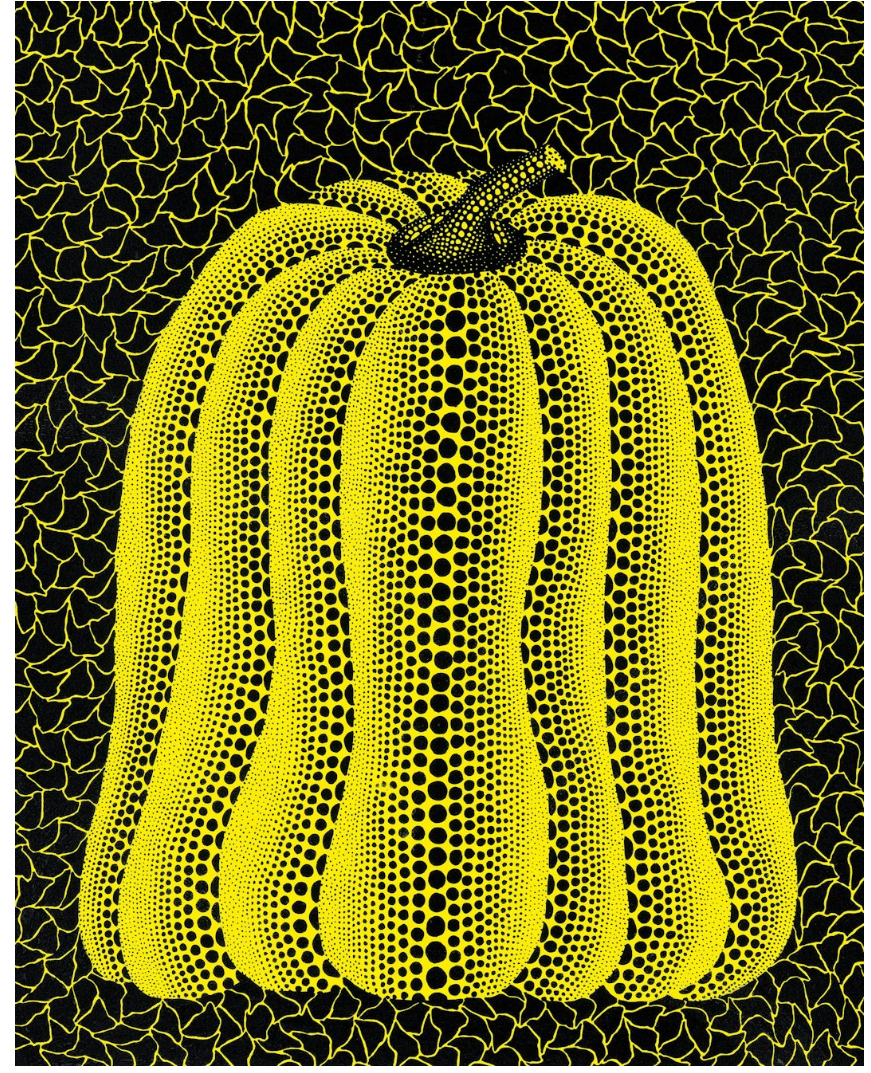 Kusama’s affinity with the misshapen gourd is rooted deeply in the artist’s biography. Growing up on her family’s seed farm in Matsumoto, Kusama was surrounded by the natural world, an environment that directly informed the severe auditory and visual hallucinations that the artist first began to experience as a child. However, where her recollections of other animated plants and accumulating talking flowers take on more terrifying dimensions that the artist would compulsively return to in her phallic soft sculpture installations, Infinity Nets, and mirrored environments, the pumpkin provided an altogether more comforting vision.