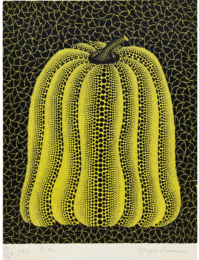 Yayoi Kusama’s Pumpkin captures her iconic pumpkin motif in a striking yellow, set against a black background patterned with interlocking yellow triangles. The pumpkin, floating at the center, is adorned with Kusama’s signature black polka dots, whose varying sizes create a mesmerizing, almost illusionistic sense of depth. These dots accentuate the pumpkin’s rounded, undulating segments, drawing the viewer’s gaze across its sculptural form. The pumpkin’s curves culminate in a stem tilted to the right, further enhancing its dynamic presence. This work is a quintessential example of the infinite repetition and accumulation that best defines Kusama’s practice, through which she transforms the humble pumpkin into a vivid allegory of her unique artistic and personal world.