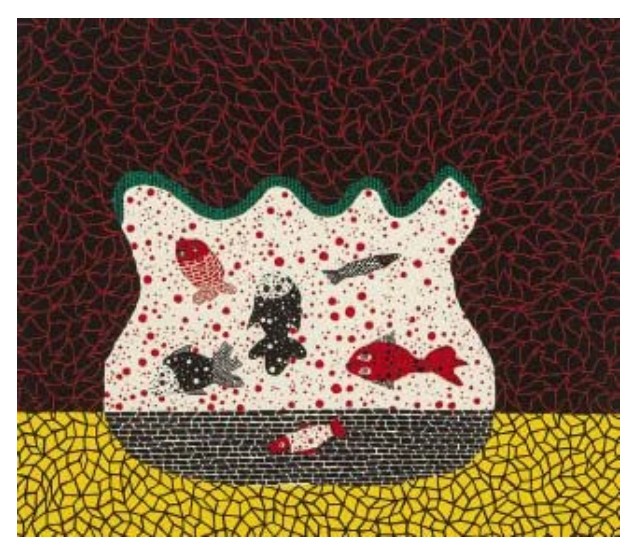 - Infinity and Self-Obliteration: The repetitive motifs create a sense of endlessness, symbolizing the artist’s desire to dissolve her ego and merge with the infinite cosmos. The fish, as individual forms within a vast, patterned environment, reflect her belief in the interconnectedness of all things.