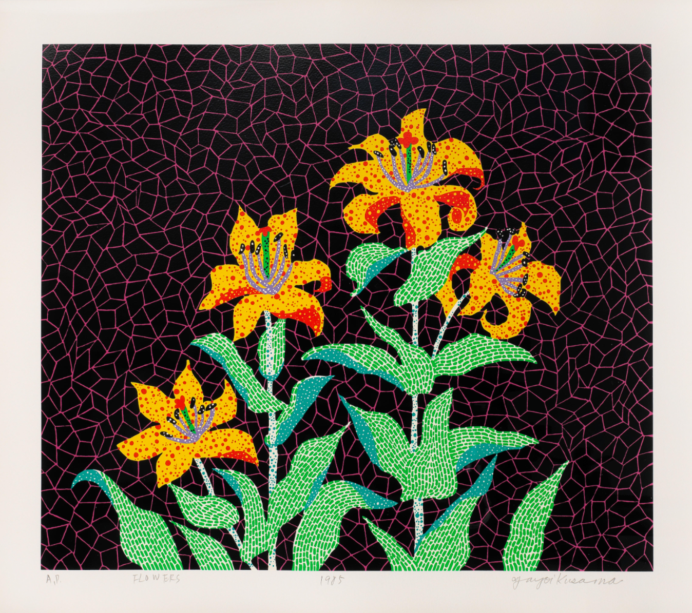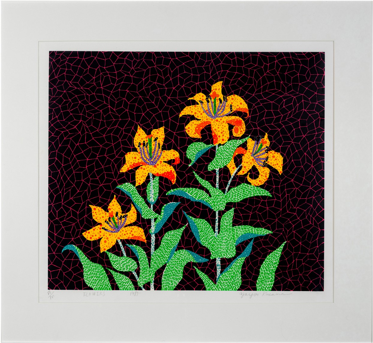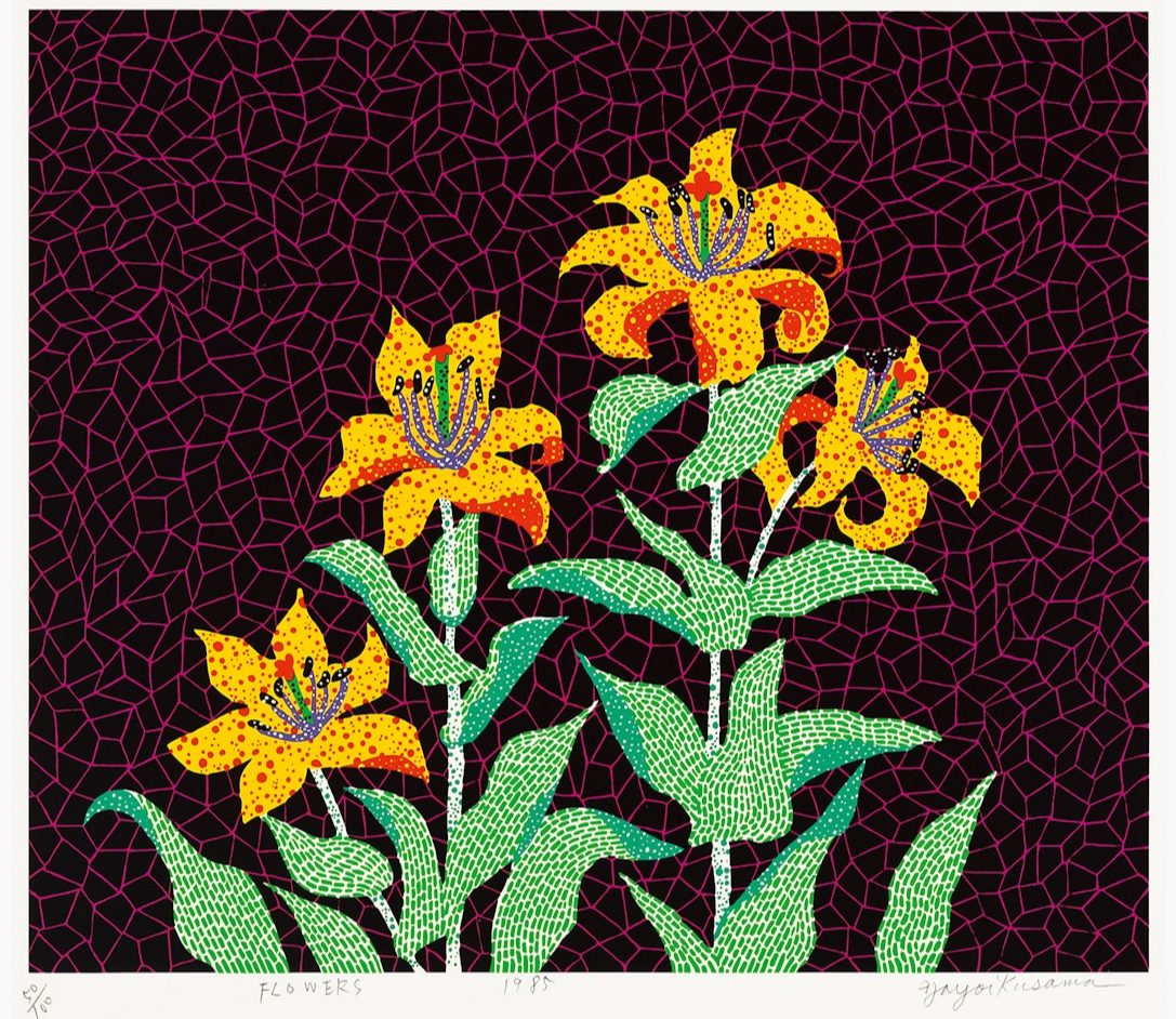 Numbered, titled, dated and signed ‘88/100 FLOWERS 1985 Yayoi Kusama’ (lower edge)