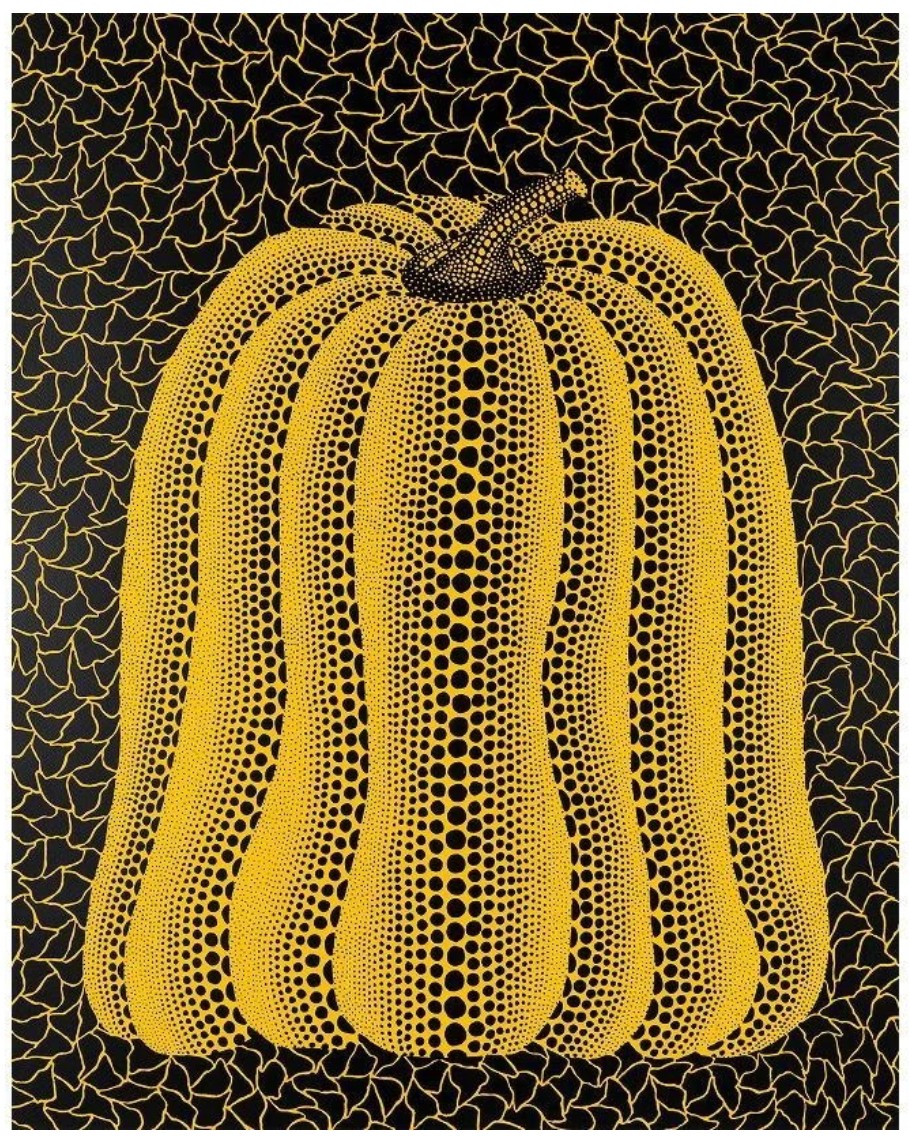Conceptually, Pumpkin feels like a moment of equilibrium. The motif has fully shed anecdote and has not yet acquired mythology. It stands as a resolved form: self-contained, confident, and unthreatened by its surroundings. The pumpkin is no longer defending itself against chaos; it has learned to coexist with it. In the broader arc of Kusama’s pumpkin imagery, this work exemplifies quiet authority. It does not provoke, dazzle, or dominate. It simply remains: solid, rhythmic, and unwavering.