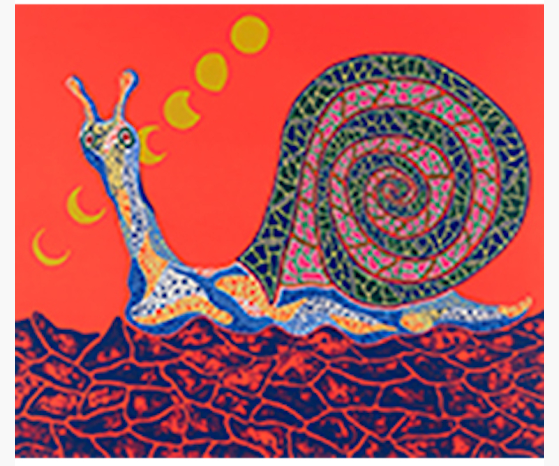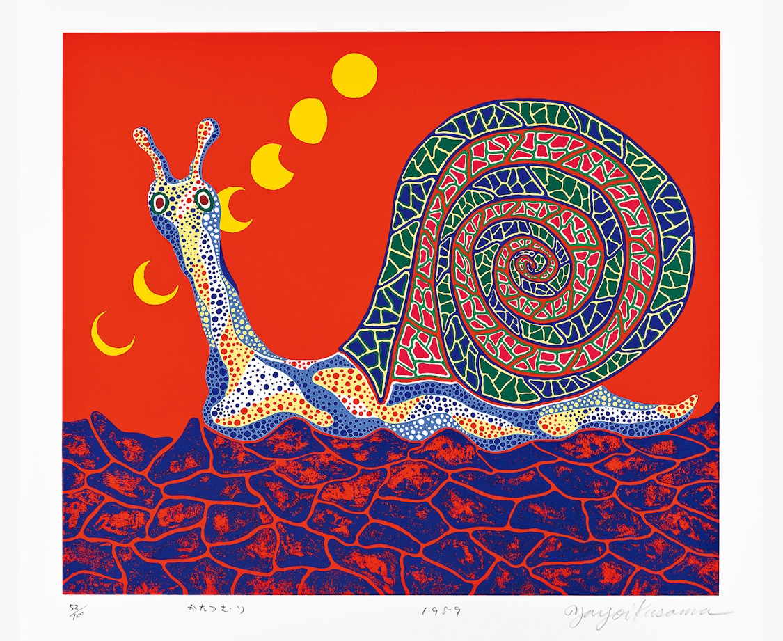 Snails hold a unique symbolism in Yayoi Kusama’s work, particularly within her exploration of earth-bound creatures. In her art, snails often represent themes of patience, persistence, and the slow but steady progress of life. The snail’s spiral shell, a recurring motif in Kusama’s prints, mirrors her fascination with infinity and the cyclical nature of existence.