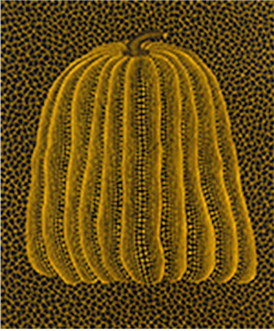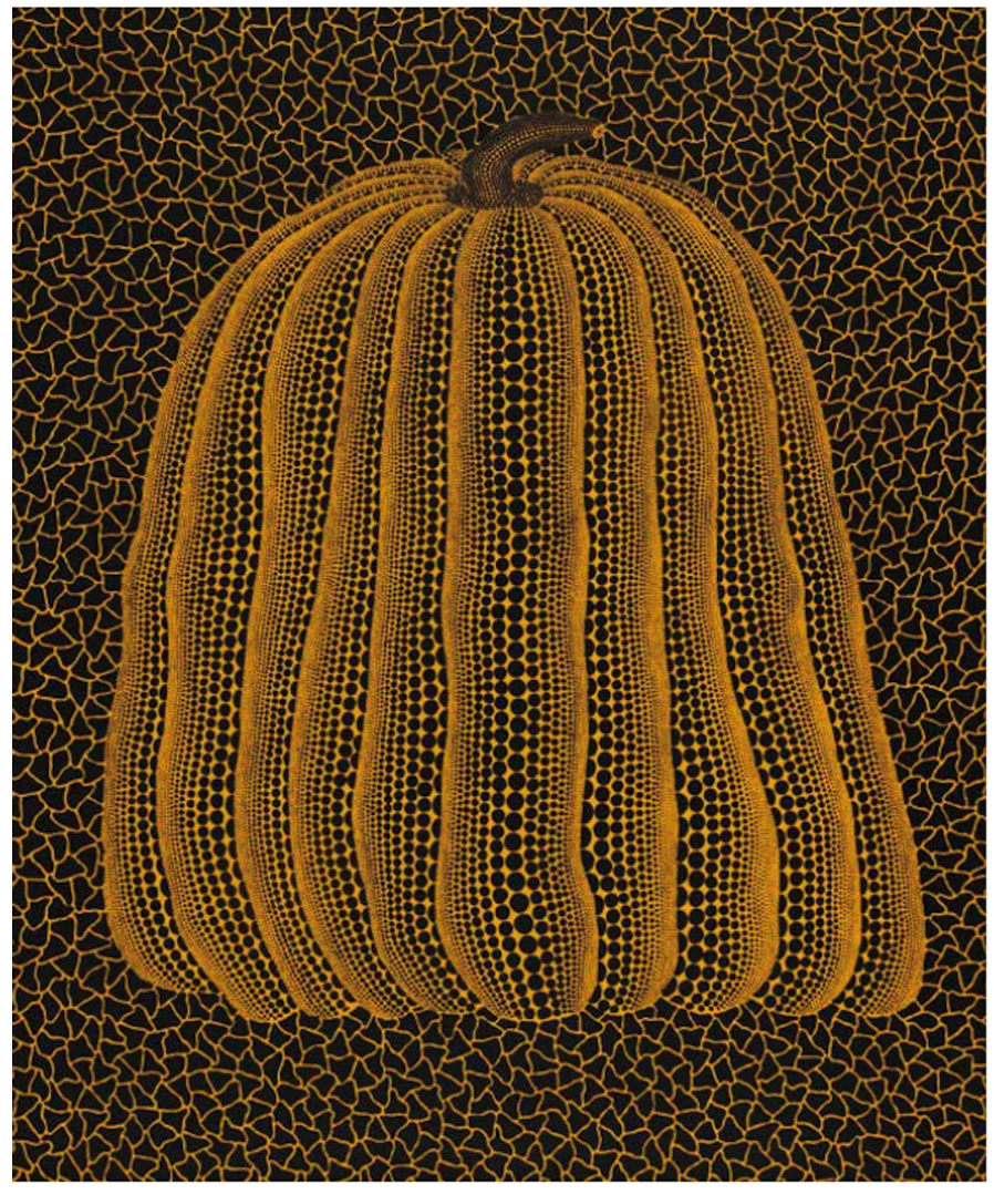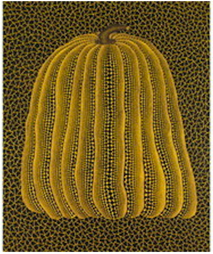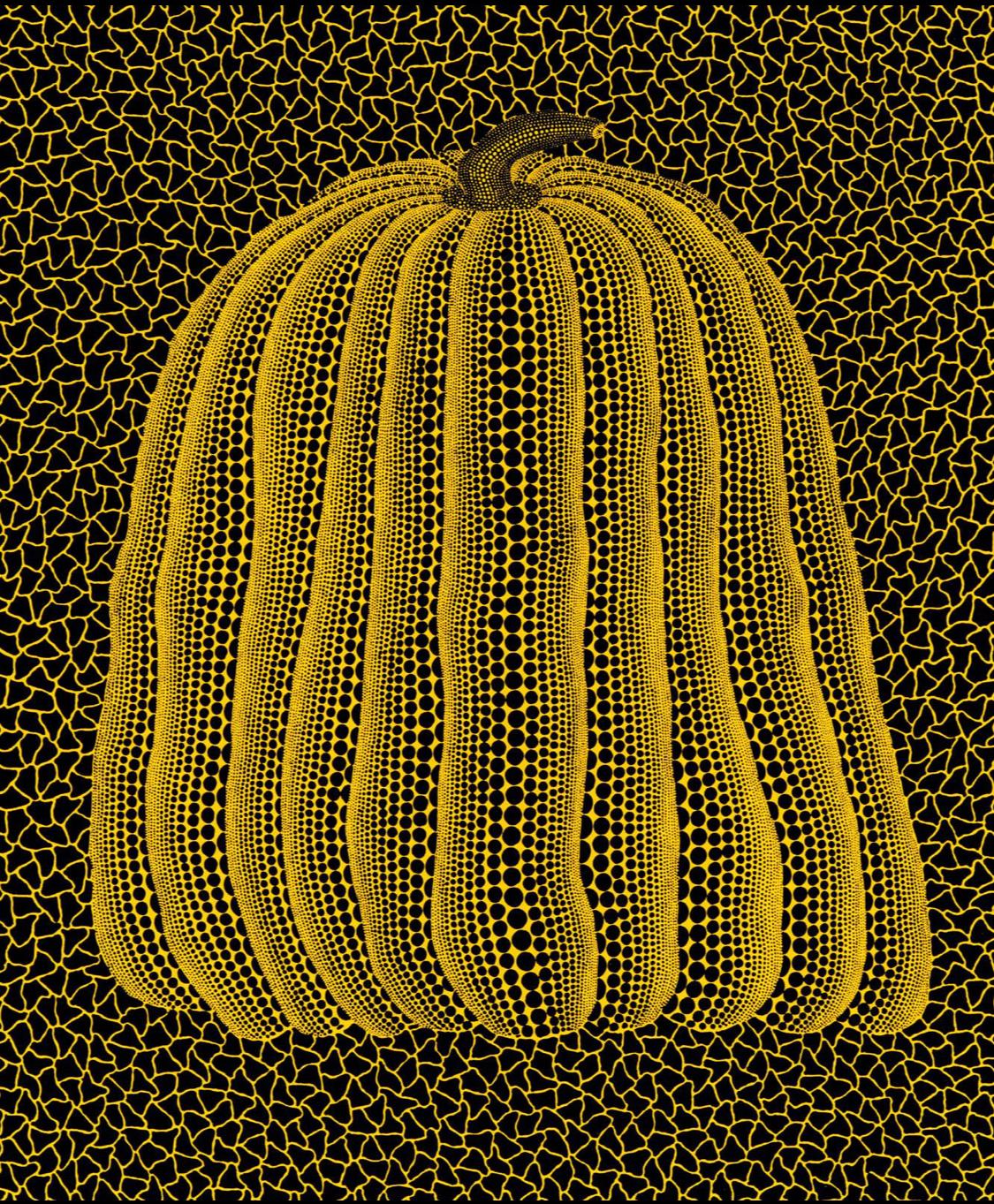 To Kusama, the pumpkin is a motif of comfort, stability, and modesty. Unlike some of the other hallucinations (flashes of light, fields of flowers) that frightened her as a child, she found the “charming and winsome form” of pumpkins to be a source of calm and rootedness. Kusama uses the repetitive depiction of the pumpkin to cope with her lifelong psychological struggles and hallucinations, transforming her fears and anxieties into art. The pumpkin motif is often viewed as a form of self-portraiture for Kusama, its whimsical yet sturdy form mirroring her own resilience and vulnerability. The signature polka dots and net patterns, which cover the pumpkin and the background, represent her desire for “self-obliteration”: the dissolution of the individual self into the infinite universe. The dots can be seen as cells or planets, elements within an endless cosmos. In Japanese culture, the kabocha (pumpkin) is associated with good luck, substance, and nourishment, adding a layer of positive energy and abundance to the work.
