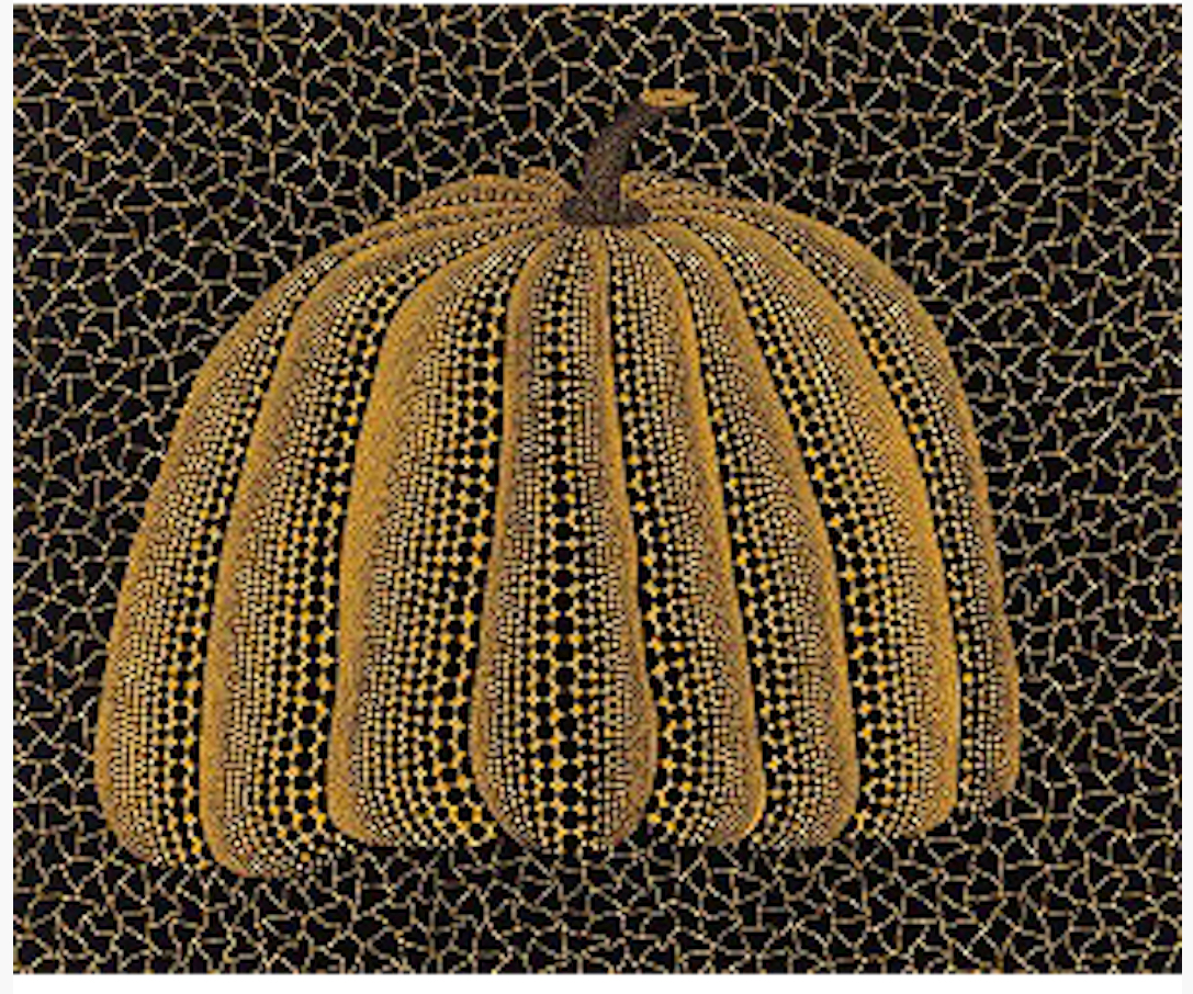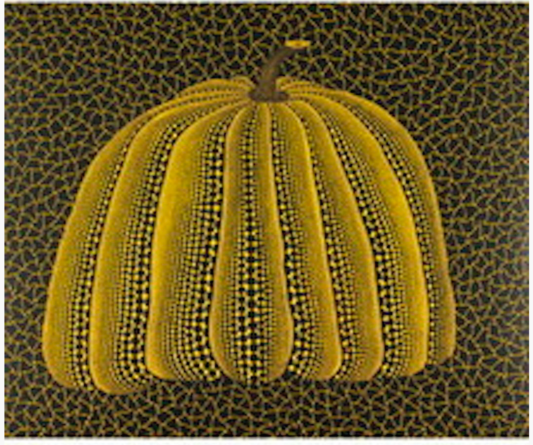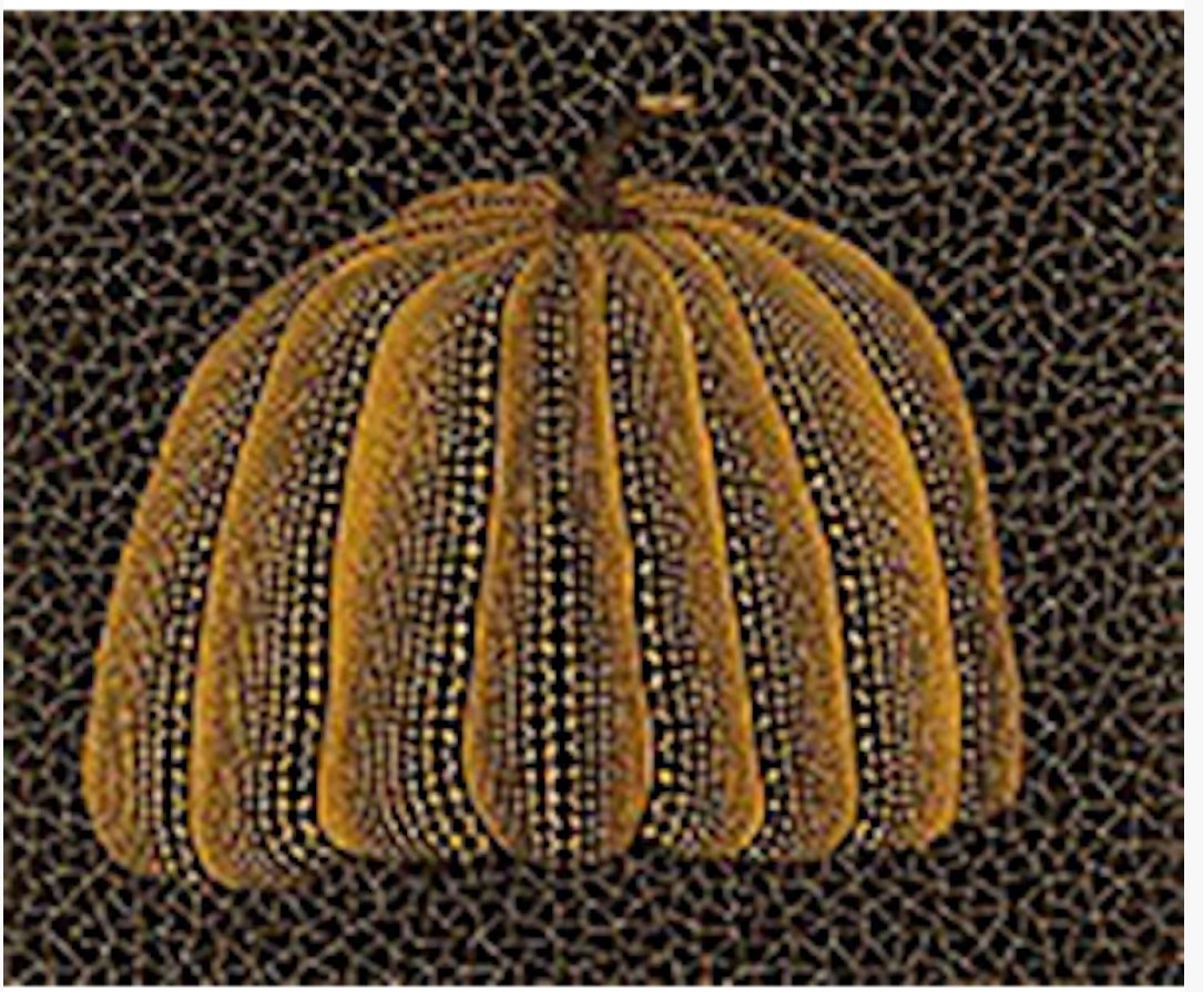 Technically, the print demonstrates Kusama’s full command of graphic repetition. Every dot feels placed rather than produced. The surface retains a tactile quality despite its precision, a reminder that her repetition is psychological before it is mechanical. This is not pattern as decoration, but pattern as containment. Conceptually, this work suggests a calmer phase in Kusama’s relationship with the pumpkin. If earlier versions asserted stability against chaos, this one assumes stability as a given. The pumpkin is no longer a defense mechanism; it is a state of being. It sits quietly, confidently, without needing borders, zigzags, or chromatic warnings.