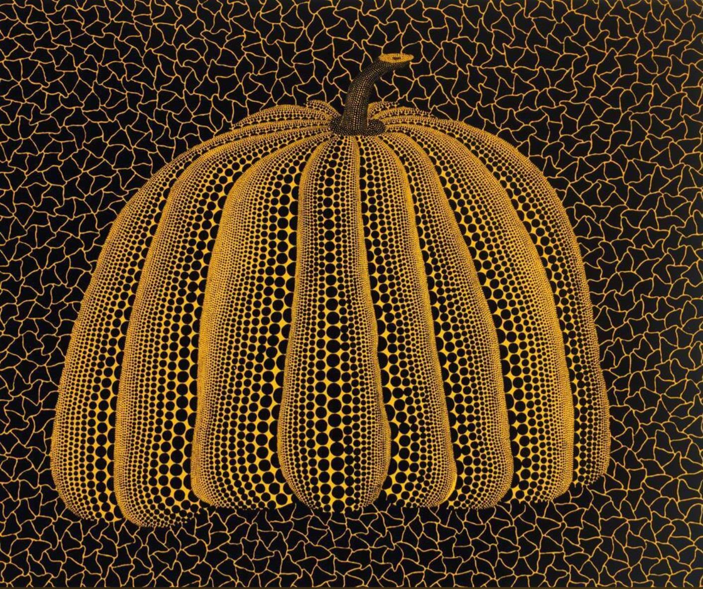 Pumpkin (Yellow Y) marks a subtle but decisive shift in Yayoi Kusama’s treatment of the motif: less graphic confrontation, more internalized density. By the early 1990s, the pumpkin had fully stabilized as one of her most enduring visual anchors, and this work reflects a moment of consolidation rather than experimentation. The pumpkin is rendered with exceptional restraint. Its ribs are elongated and evenly weighted, and the polka dots, meticulously graded in size, generate volume through optical accumulation rather than contrast. Unlike earlier prints where dots oscillate aggressively between scales, here they are disciplined, almost meditative. The form feels heavy, grounded, and self-contained, as if it has settled into itself. The background is significant in its relative quiet. The black field is animated by fine, looping yellow lines, an echo of Kusama’s infinity nets, but they remain secondary, receding rather than competing. This creates a sensation of depth without agitation. The pumpkin does not battle its surroundings; it emerges from them. The overall effect is one of absorption rather than tension. Color is handled with notable sophistication. The yellow is warmer, slightly muted, less assertive than the acid yellows of the early 1980s. Against the black ground, it reads not as a signal but as a presence. Kusama’s yellow here is no longer protective in opposition to darkness; it coexists with it. The stem, slender and subdued, avoids dramatic emphasis, reinforcing the work’s inward tone.