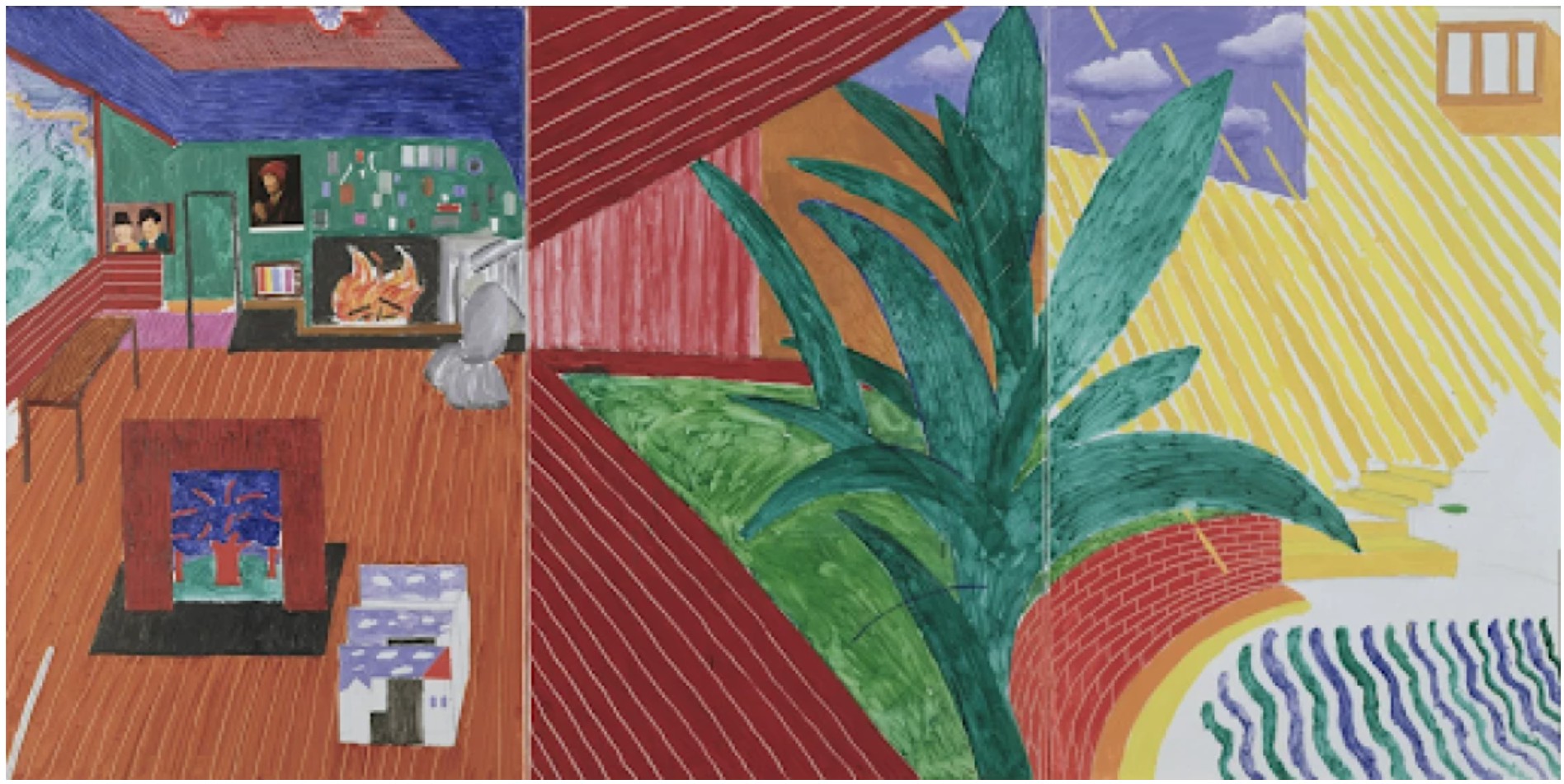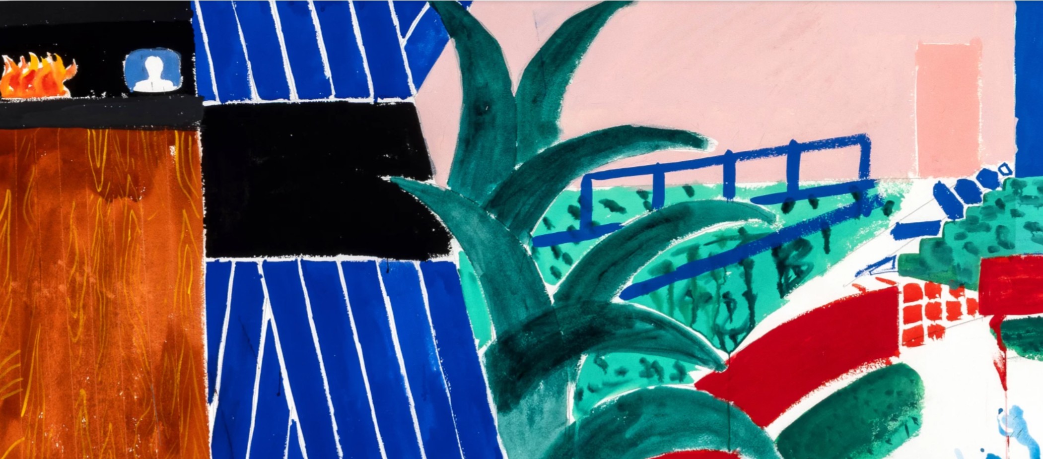 The composition itself is a dialogue between interior and exterior, between natural and architectural elements. On the left, Hockney suggests the cozy interior of a modernist home—a sliver of wooden floorboards, a glowing fireplace, and a grey geometric ceiling above a dramatic blue curtain, rendered in bold diagonal lines. These vibrant theatrical stripes recall not only the artist’s enduring interest in stage design but also the dynamic interplay of movement and stasis that characterizes his best work. The curtains part to reveal a visual cascade of botanical and architectural forms: lush banana leaves thrust upward, while red and green arcs delineate the curve of a terrace leading toward the stylized undulations of a sunlit swimming pool.