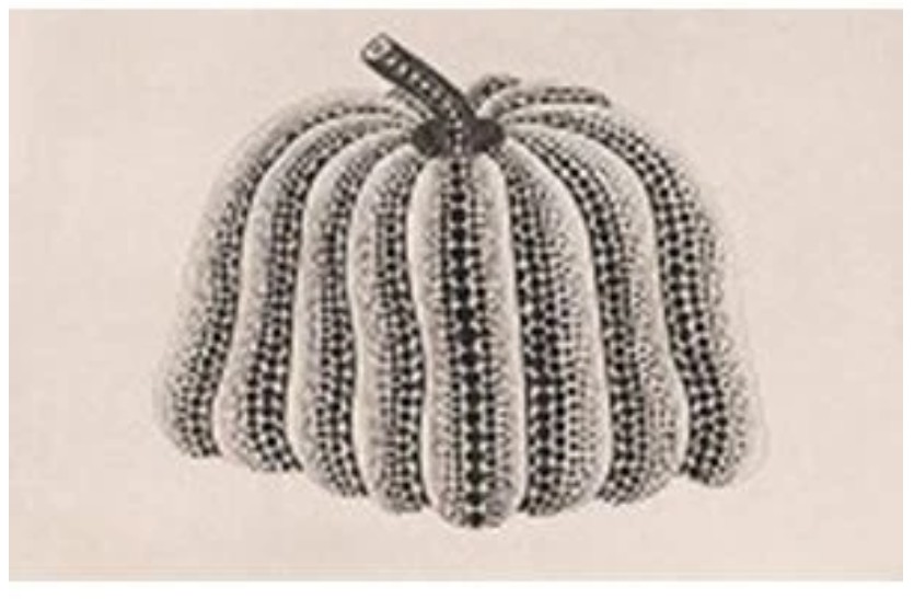 Pumpkin presents a striking black pumpkin set against a calm pale background. The pumpkin, with its smooth, rounded form, is adorned with Kusama’s signature polka dots, creating a simple yet compelling contrast. The dots, varying slightly in size, add depth to the pumpkin’s silhouette, accentuating its bulbous shape. The pumpkin’s stem, gently tilted to the left, adds a subtle dynamic to the otherwise minimalist composition. This work captures Kusama’s ability to evoke depth and movement within a pared-back, geometric framework, transforming the pumpkin into a quiet but powerful symbol of her artistic vision.