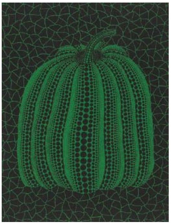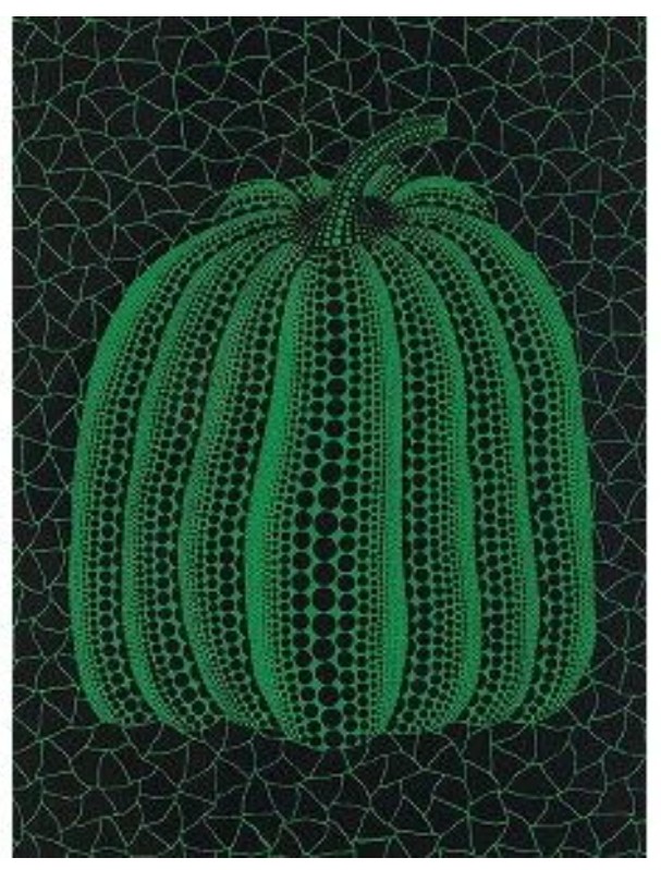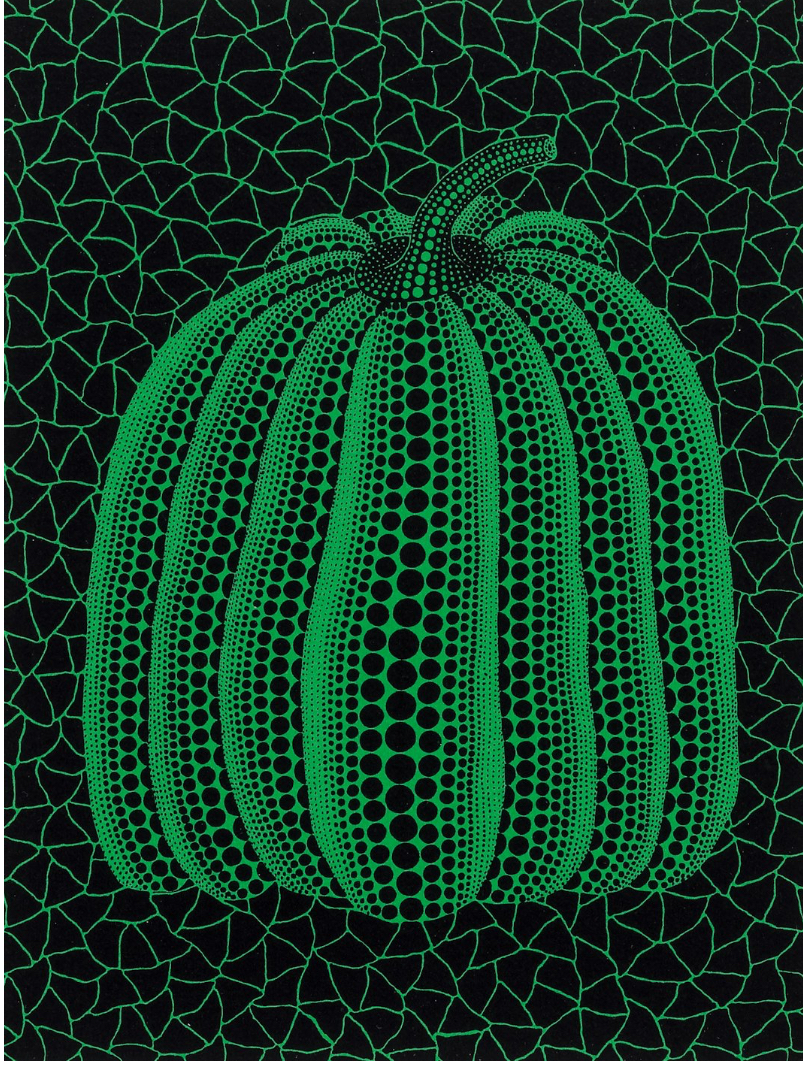 Conceptually, the pumpkin continues to function as a stabilizing motif within Kusama’s universe: familiar, grounded, and reassuring. At the same time, the repetition of dots and the surrounding network evoke her broader exploration of infinity, accumulation, and psychological containment. The green colorway subtly alters the reading of the image, shifting it away from warmth and playfulness toward something more restrained and contemplative, while remaining firmly within her symbolic system.