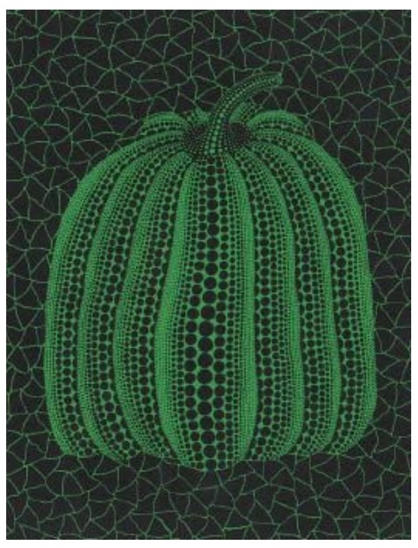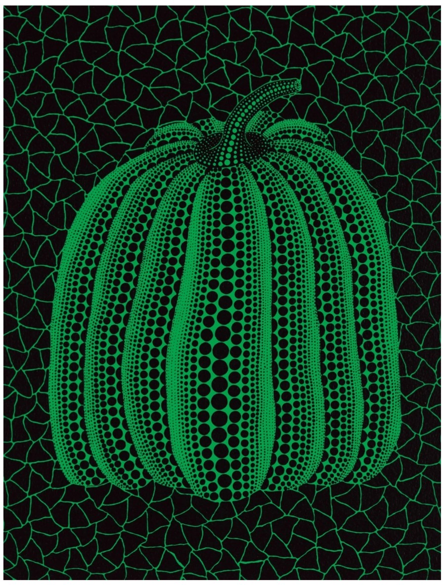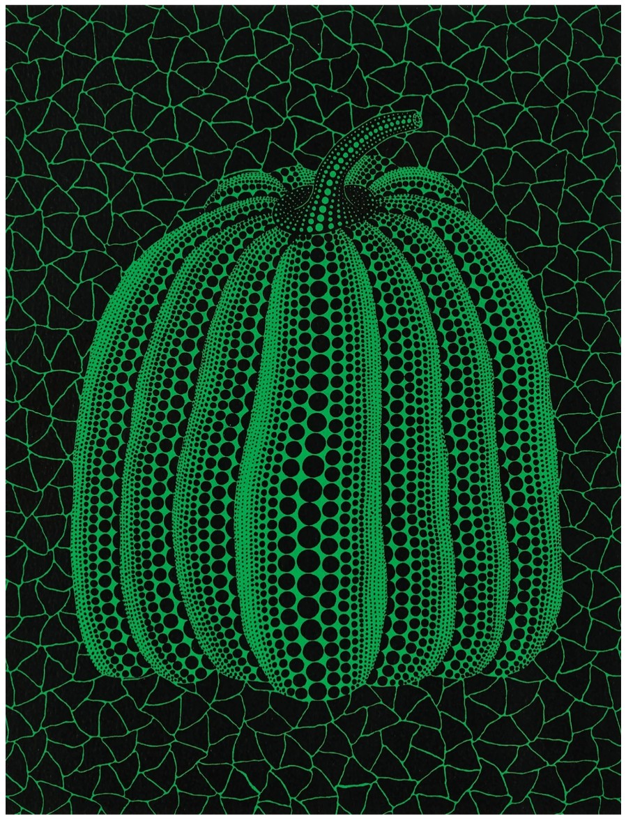 Pumpkin (GT) presents a striking chromatic variation within Yayoi Kusama’s established pumpkin iconography. The composition remains frontal and centered, with the pumpkin occupying the majority of the pictorial space, yet the palette shifts decisively toward a deep, saturated green set against a black ground. The surface of the pumpkin is structured through vertical ribs composed of densely arranged black polka dots, carefully calibrated in scale to suggest volume and curvature. Technically, the print exemplifies Kusama’s disciplined approach to graphic production during the mid-1990s. The dot patterns are precise and consistent, reinforcing a sense of order and control, while the green hue, less common than her emblematic yellow, introduces a cooler, more introspective tone. The background is filled with an irregular, net-like pattern in green lines, creating a visual field that both frames and destabilizes the central form.