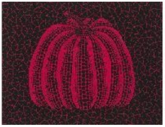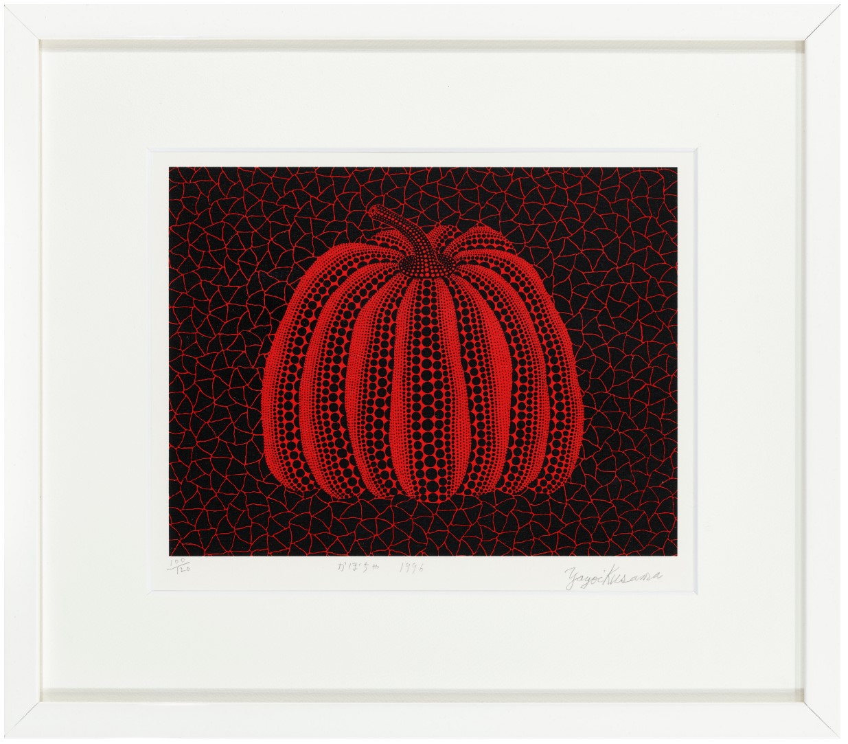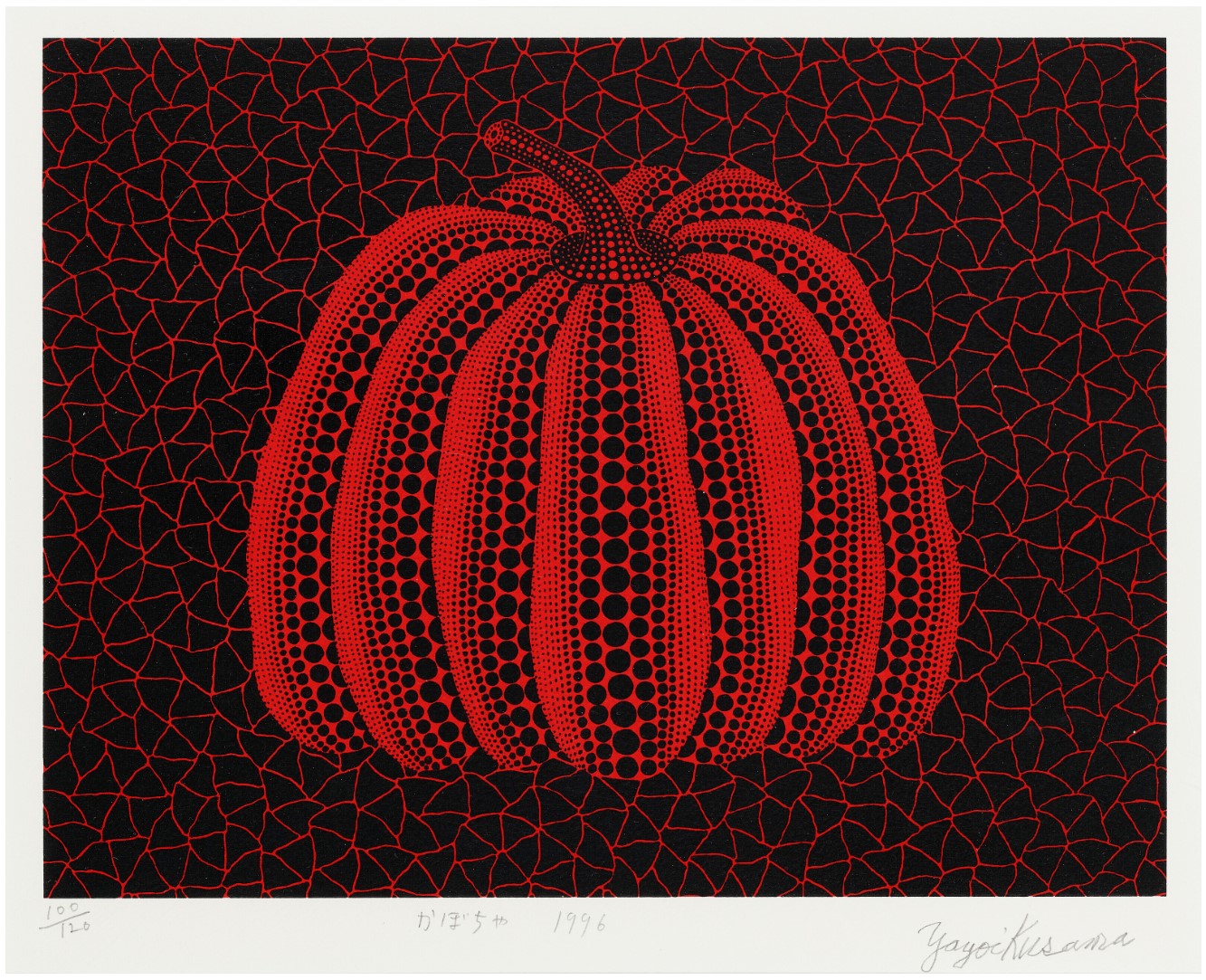 The pumpkin has preoccupied Kusama since her childhood in Japan, stemming from her family’s nursery business and her early experiences of hallucinations; specifically, a pumpkin which spoke to her younger self from a vine. However, where some of Kusama’s visions are terrifying, the artist’s fascination with the fruit is drawn from its “humorous form” and the “warm feelings” it evokes. Kusama frequently recalls the “human–like” essence of pumpkins, offering each print its own personality, individually personified. Kusama exaggerates the postures of the pumpkins, ranging from slumping to proud, large or diminutive. By continuing her exploration of self-obliteration through her pumpkins, the artist continues her creation of what she calls “Kusama world” – a unique, immersive artistic universe, characterized by her obsessive polka dots, infinity rooms, and, most importantly, pumpkins.