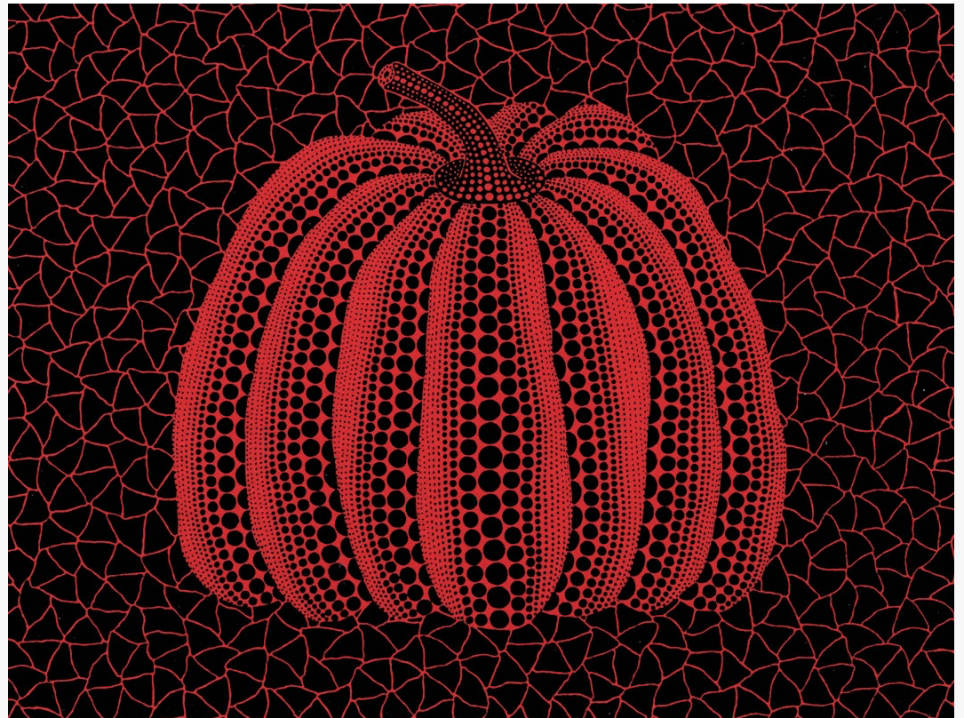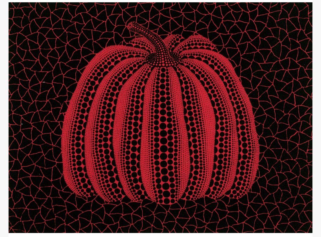 Bursting forth from a red, crackled background is Yayoi Kusama’s iconic motif: the polka-dot pumpkin. Characteristically fitting with the artist’s eccentric personality, the print is a symbol of organized chaos. Seemingly shifting in size before our eyes, the dots which compose the pumpkin symbolize the obliteration of the self and the vast cosmos, whereas the mesh-like infinity nets that blanket the background represent the interconnectedness of life. Combined with her dots, the composition becomes a repetitive meditation, a therapeutic relief which allows the artist to combat anxiety.