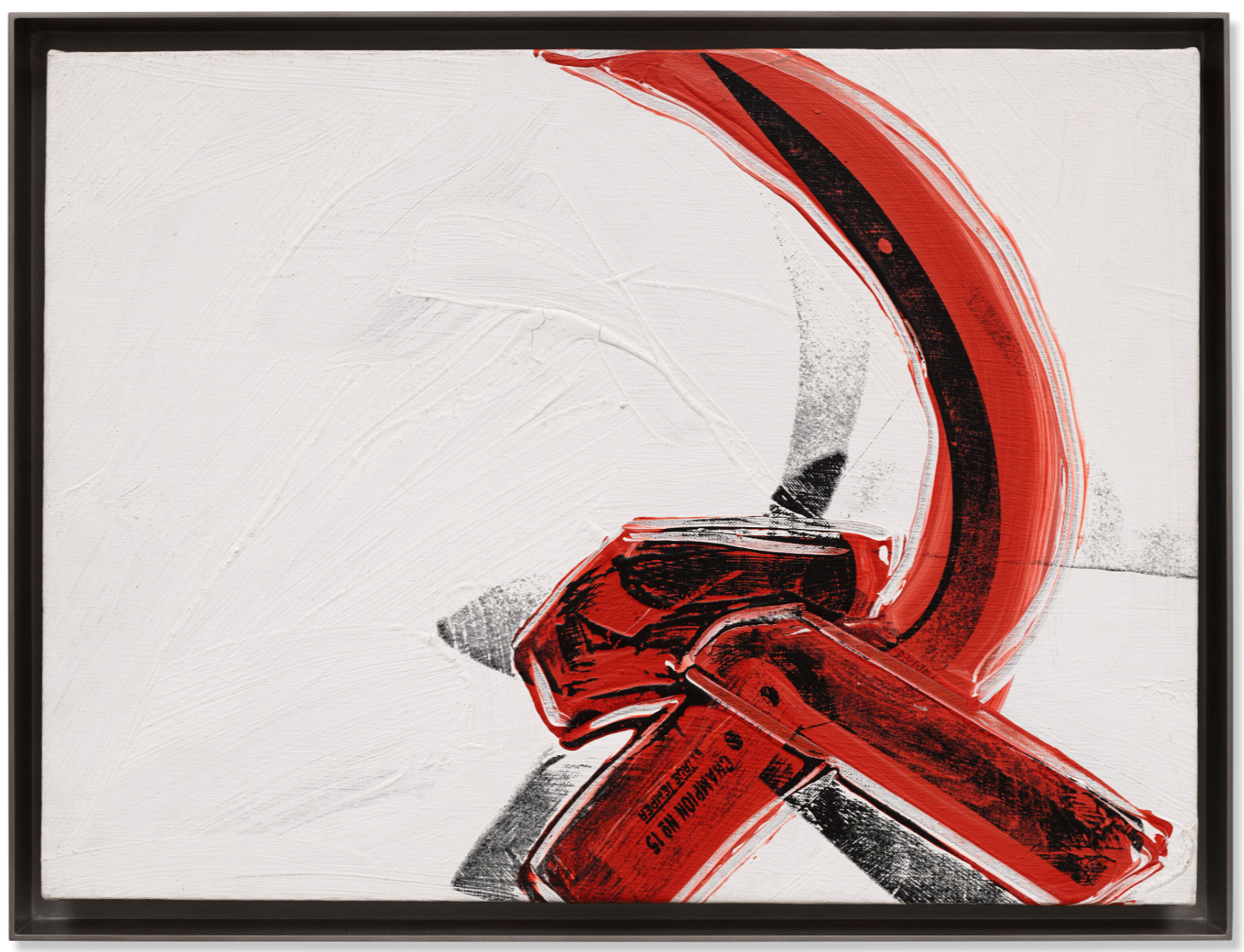 For all his much-documented interest in the depthless ‘surface’ of things – even his own blank persona reflected the mechanical flatness of his endlessly reproducible silkscreens – Warhol was also alive to the possibilities of three dimensions. His use of real objects in Hammer and Sickle allows him to deconstruct the flat elements of the Communist symbol, reconstituting them as an ambiguous still life. Remembering the genesis of the series, Cutrone says Warhol asked him to find a ‘three-dimensional’ example of the hammer and sickle on his return from Italy. ‘Well, for a couple of weeks – three weeks, actually – I was going to all the Communist stores in New York trying to find something that was three-dimensional, and there just wasn’t anything’, Cutrone recalls. ‘Most of the symbols I found were just flat. So, we decided to use the real objects. So, I went to a hardware store, a number of them, and picked out the best hammers and sickles I could find and brought them back and shot them with three or four rolls of film, all different ways, using different lighting’ (R. Cutrone, quoted in P. S. Smith, Andy Warhol’s Art and Films, Ann Arbor 1986, pp. 278-79). The ‘three-dimensional’ version of the symbol that resulted – Warhol would use seventeen different photographs as a basis for the silkscreens – opens up a diversity of new readings. Created at a time when the Cold War was ongoing and the Bomb a very real threat, the hammer and sickle’s weighty appearance as potential weapons might lend them an edge of physical menace. At the same time, they display a bathetic mundanity when unmoored from the symbol and exposed as everyday objects in themselves; ironically, of course, this particular hammer and sickle purchased from a New York hardware store function as consumer goods in a Capitalist system (part of the ‘CHAMPION’ logo stamped on the sickle’s handle can be glimpsed in the present work). With its sharp, dynamic red, black and white shapes, Hammer and Sickle could also be said to wryly echo the abstract visual language of Russian Constructivism, which posited art as a social force in service of the Revolution during the early twentieth century.