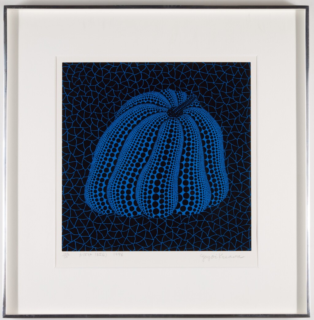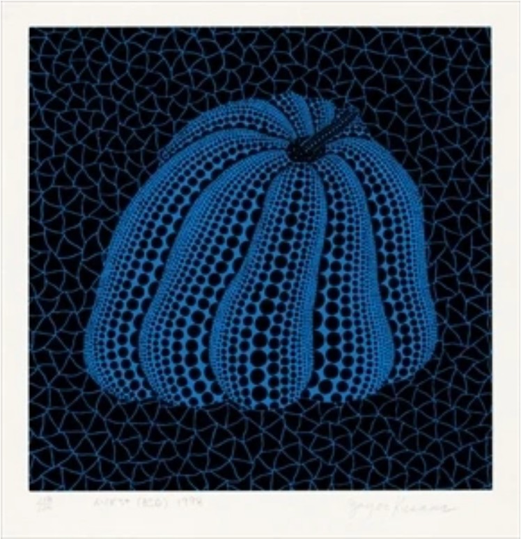 The choice of blue is significant. Unlike Kusama’s more familiar yellow pumpkins, which often convey warmth and immediacy, blue pumpkins from this period tend to read as cooler and more introspective. They reflect Kusama’s long-standing interest in psychological balance and repetition as a means of imposing order. The pumpkin itself, a form rooted in her childhood memories and rural upbringing, operates as a personal symbol of comfort and continuity.