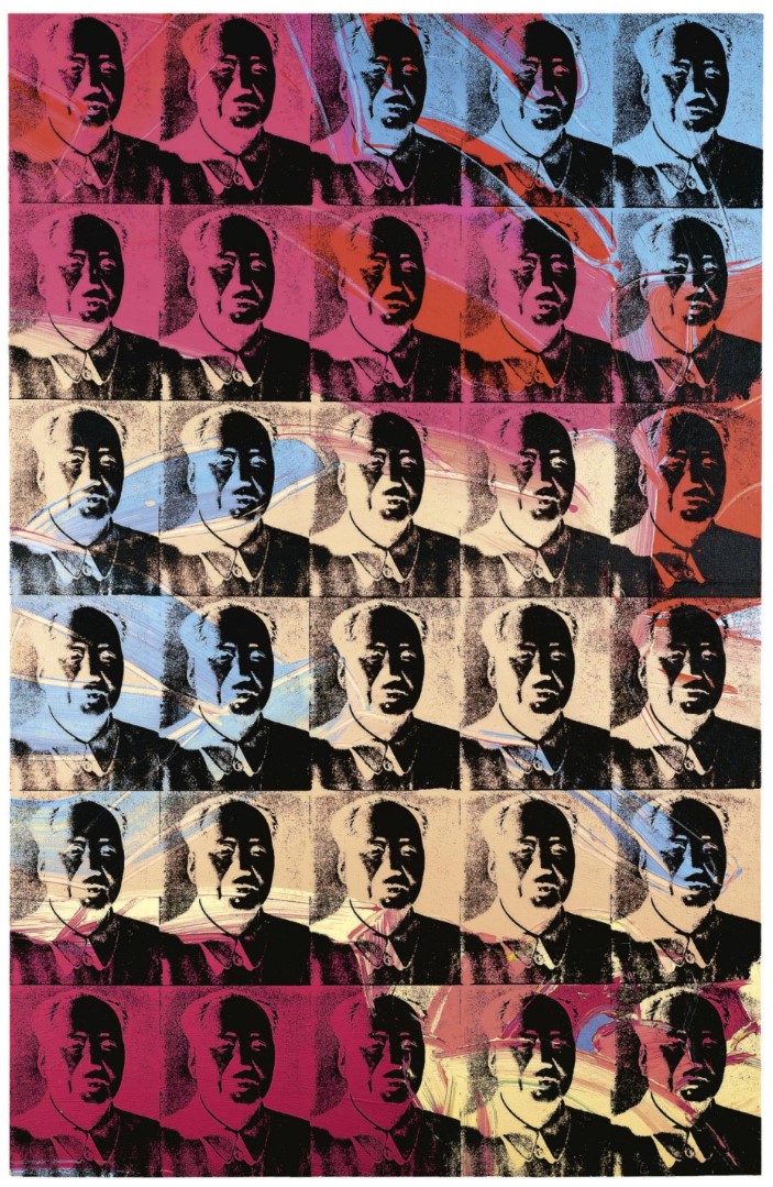 Set against this glossy, richly textured acrylic ground, Warhol screens six rows of five Maos. The lustrous black silkscreen ink clings to the ridges of acrylic under-painting to create a uniform, unbroken and delicate aesthetic unity. As David Bourdon describes: “Warhol’s Reversals recapitulate his portraits of famous faces… but with the tonal values reversed. As if the spectator were looking at photographic negatives, highlighted faces have gone dark while former shadows now rush forward in electric hues” (David Bourdon, Warhol, New York 1989, p. 378). In the present example, not only is the image printed in negative, but it is also reversed with Chairman Mao looking right instead of left. Through negative printing, Warhol achieves a ghostly dematerialization of his subject, with the shadowy figures now reduced to their recognition value, their memory value alone. Although still recognisable and legible thanks to its common currency, Warhol’s manipulations neutralise the power of the original image to convey meaning. In places his eyes, once dark, shine out like candy-coloured beacons in a witty parody of the original’s all-seeing gaze. Compositionally recalling the serial images of soup cans from the 1960s, through repetition Mao’s debunked image loses its potency as it is lined up in rows like the mundane products of bourgeois consumerism. In a flash of Warholian genius the Mao’s individuality, the uniqueness on which his authority depended, is swept from beneath him. In a subversive tour de force, Warhol transforms the official portrait used for the dissemination of Communism into a commodity of the Capitalist economy, no more consequential than a can of soup or box of Brillo.