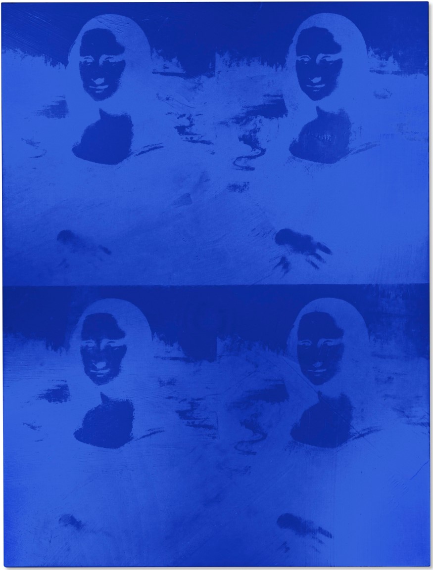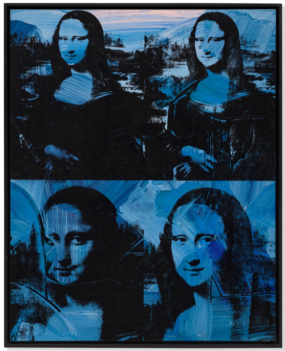 An avid consumer of popular culture, Andy Warhol would undoubtedly have been aware of the Mona Lisa’s visit, and in 1963 he produced a discreet series of mainly black and white canvases featuring Da Vinci’s famous painting. Fifteen years later, 1978, Warhol turned his attention again to the famous painting and produced Blue Mona Lisa, a bejeweled canvas featuring four images of the most famous face in art history. Arranged in 2 x 2 grid, Warhol used a pair of different screens; one a full length version of the painting complete with her folded hands and the other comprised of a shorter, cropped version showing a more detailed rendition of Mona Lisa’s face. In stark contrast to his earlier Mona Lisa’s which Warhol screened onto a plain white ground, this later version has the black silkscreen ink applied directly on top of an effervescent surface of multi-toned blue hues. By using a wide brush, loaded with blue and white paint, he mixed together gigantic sweeps of pigment producing a surface that not only comes alive with a boundless sense of energy, but also produces an expansive range of color accents that range from pure white right through the blue spectrum to delicate shades of purple and mauve.