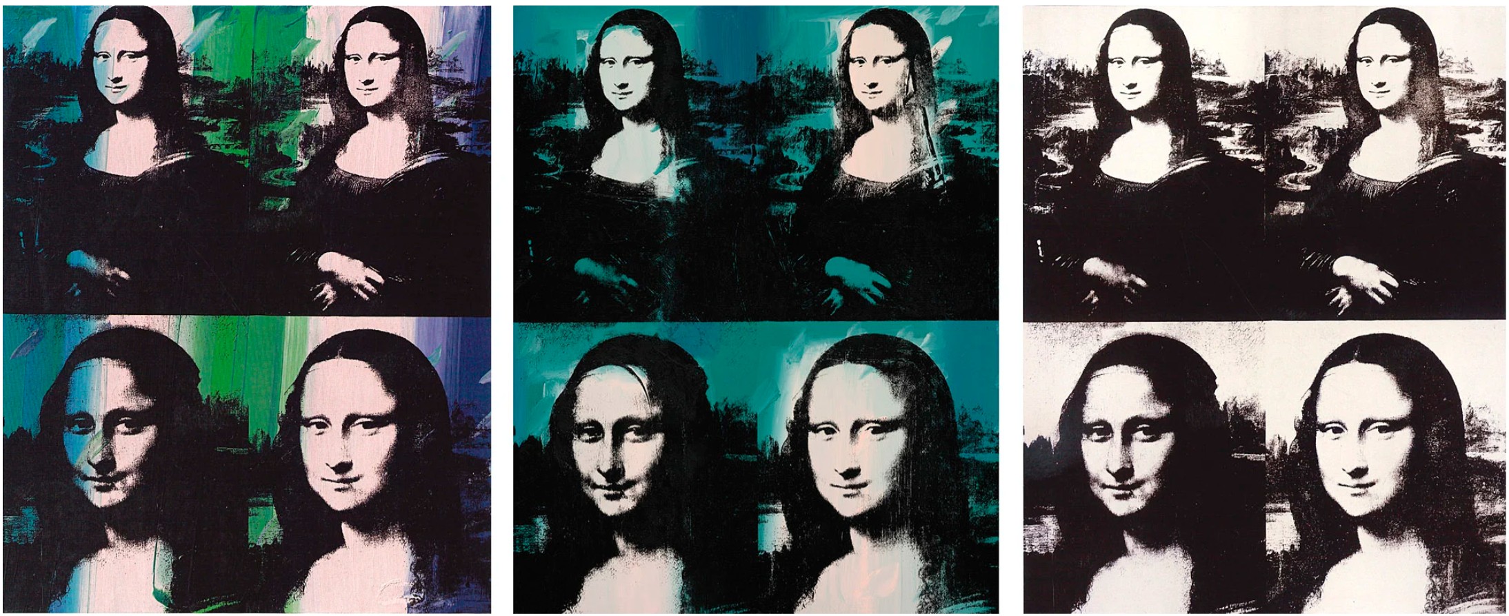 Middle: Andy Warhol, Four Mona Lisas, 1978. Art Institute of Chicago. Digital image: © 2026 The Art Institute of Chicago / Art Resource, NY/ Scala, Florence. Artwork: © 2026 The Andy Warhol Foundation for the Visual Arts, Inc. / Licensed by DACS, London.