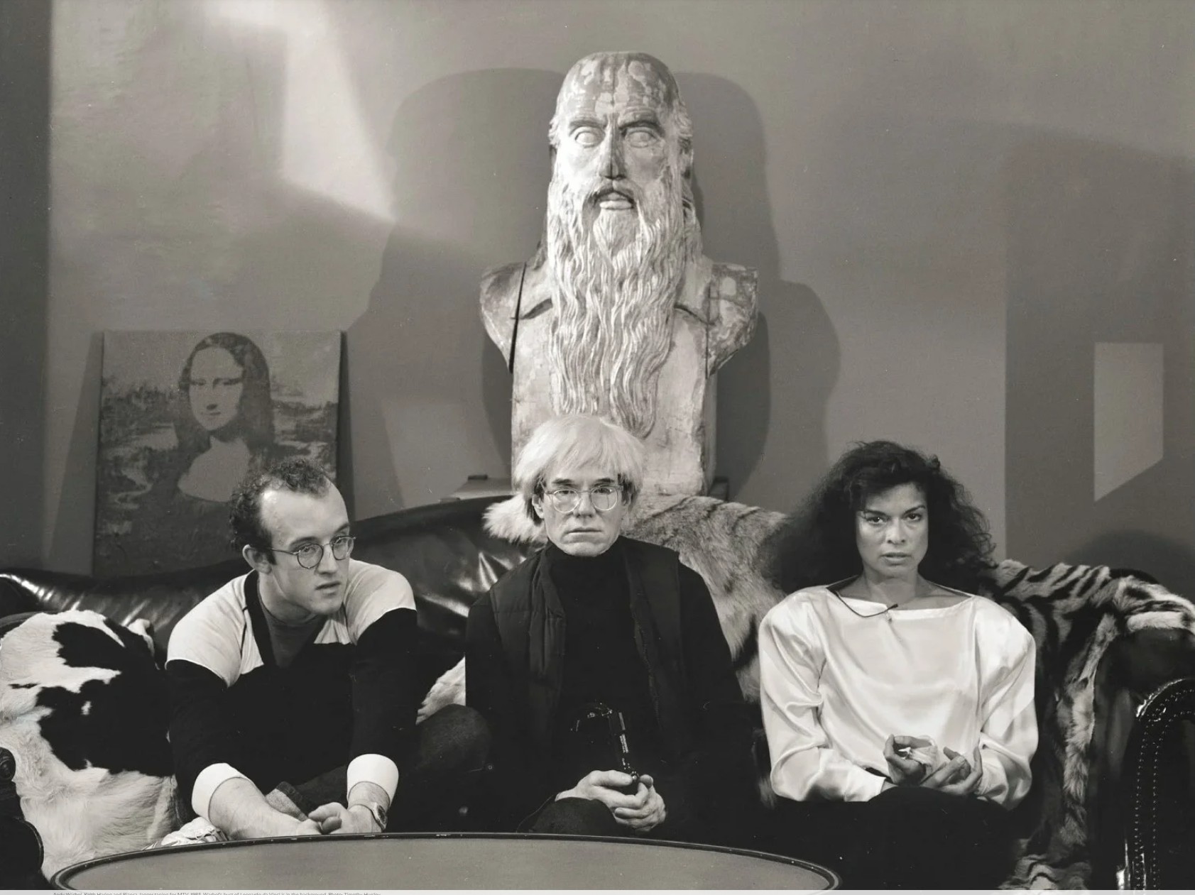 Andy Warhol, Keith Haring and Bianca Jagger taping for MTV, 1985. Warhol’s bust of Leonardo da Vinci is in the background.