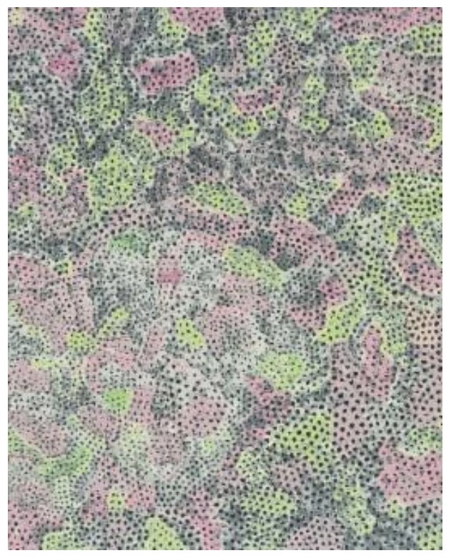 The Flowering Shinano Road depicts a landscape from Yayoi Kusama’s childhood in the Shinano region of Japan, reflecting her signature themes of infinity, self-obliteration, and a deep connection to nature. The title refers to a road in the Shinano region, which is near Kusama’s hometown of Matsumoto, an area known for its natural beauty and vast fields. The print is characterized by dense, intricate patterns, likely incorporating her signature polka dots or “infinity nets”. These elements would cover the landscape, creating a sense of overwhelming, proliferating growth. Typical of Kusama’s work, the print would employ a striking and possibly psychedelic color palette to evoke a sense of boundlessness and energy. Color plays a crucial role here. Unlike Kusama’s more iconic, high-contrast yellow-and-black works, this palette is restrained and atmospheric. The pinks soften the composition, introducing a biological, almost floral warmth, while the greens suggest growth and regeneration. The grey-blue undertones act as a stabilizing matrix, anchoring the surface and preventing the image from tipping into pure ornament. The result is a tension between calm and compulsion: the colors soothe, the repetition unsettles.
