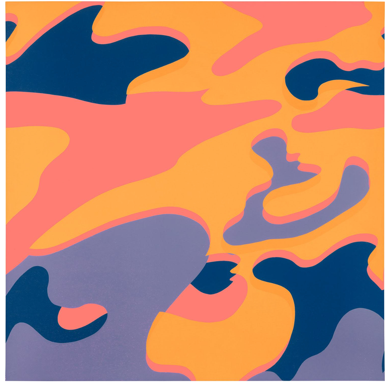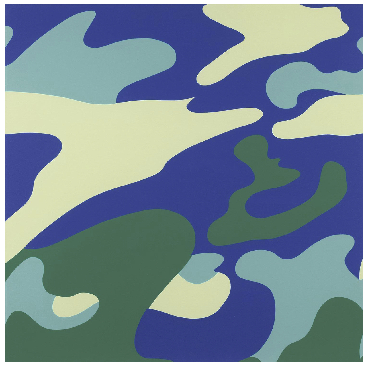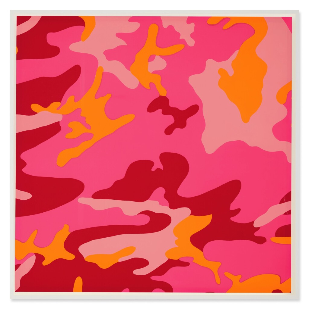 Moving beyond depictions of iconic figures, Warhol’s final print portfolio contrasts the individuality of his typical portraiture with the uniformity of camouflage. Designed to blend in with an environment and strongly associated with the armed forces, camouflage’s paradox of being a pattern of disguise yet identifiable by the masses may have appealed to Warhol’s sensibilities towards brands and logos. Universally recognizable, the pattern bears further connotations of masculinity, landscape, and nationality, themes of which Warhol addressed throughout his prolific career in printmaking.