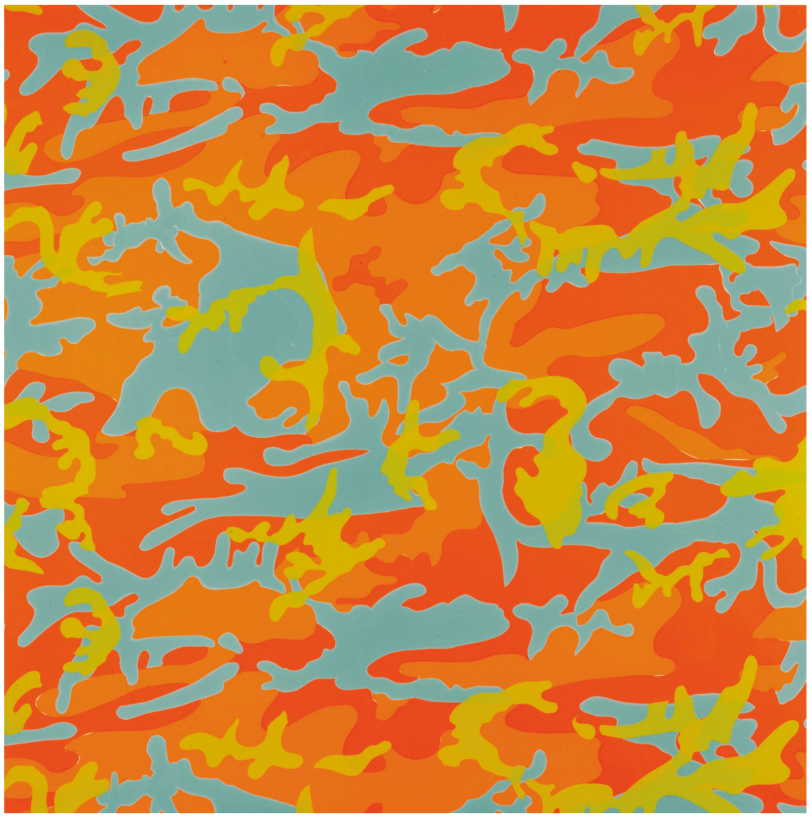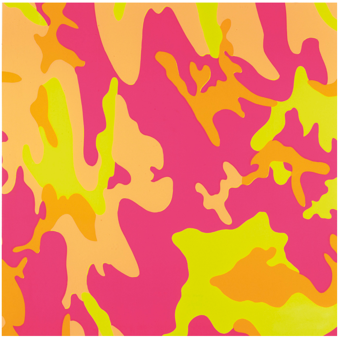 It was studio assistant Jay Shriver who experimented with a new painting technique in the late 1980’s, pushing paint through military cloth, who gave Warhol the idea of appropriating the combat related imagery. Warhol was intrigued by the all-over repetitive pattern of camouflage, with its leaf-shaped sprigs and islands, that represented the abstract expressionist paintings of his contemporaries. Using photographs taken of clothing purchased at an army surplus store, Warhol transposed and carefully altered the camouflage designs with a psychedelic palette. Playfully abstracting the patterns, the artist defied the print’s original purpose to disguise, and instead pushed the designs to center stage with vibrant fluorescent colors. The result was a set of eight screen-prints, each with different colors and varying levels of depth, that would form one of the artist’s final projects.