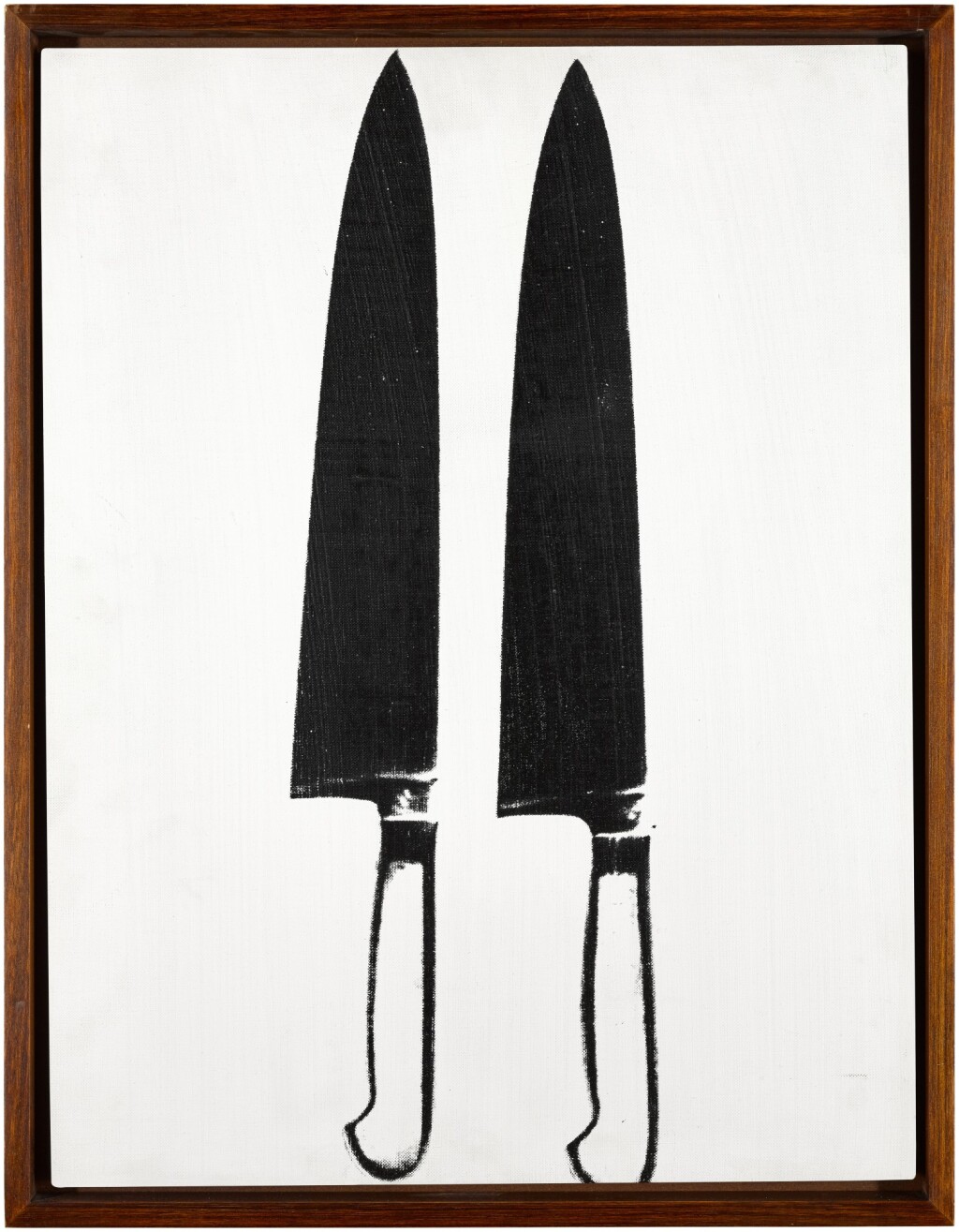 Andy Warhol’s Knives is a haunting, yet riveting black and white acrylic and silkscreen painting that dynamically depicts three overlapping perpendicular kitchen knives. The commonplace knives are transformed into a glorified object that takes on a sinister and menacing character; a macabre feeling emphasized by the sharp contrast of black against white background. The black ink is applied to the canvas in silkscreened layers, creating complex gradients between the knives that generate a cinematic appearance, alluding to Warhol’s influence of film and printmaking. These monochromatic layers that shift from dark to light suggest a sense of movement, accentuating the theatrical violent and threatening aspect of the subject. Despite reproducing an appropriated image of a banal object, Warhol’s Knives constructs a narrative that triggers associations of knives as more than just a domestic utility object – it elevates their ascribed definition to an ambiguous and threatening characters.