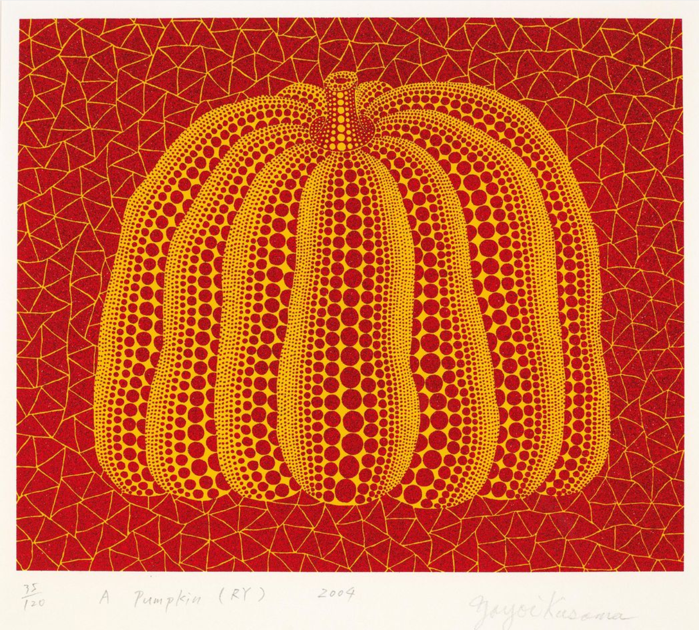 Created in 2004, A Pumpkin (RY) belongs to a period in which Yayoi Kusama revisits one of her most familiar forms through carefully calibrated variations in color and surface. The composition is direct and centered: a single pumpkin occupies the pictorial field, presented as a stable and clearly defined structure rather than a descriptive object.