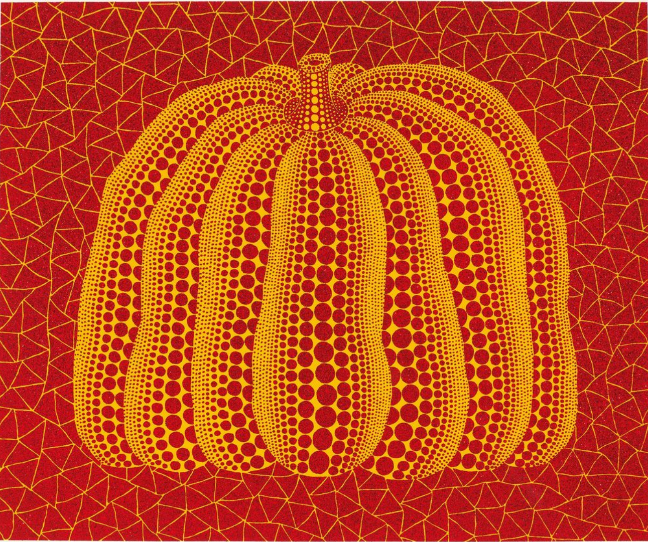 Color is central to the character of this print. The pumpkin is rendered in yellow and red, a combination that departs from Kusama’s more frequent yellow-and-black pairings. Red polka dots articulate the surface of the pumpkin, their scale shifting gradually along the vertical lobes of the form. This chromatic dialogue between yellow and red introduces warmth and density, giving the image a grounded, almost tactile presence. The background is composed of a red field overlaid with a fine yellow net pattern. This continuous network extends evenly across the surface, suggesting movement and continuity beyond the edges of the image. Set against this active background, the pumpkin remains contained and legible, its outline clearly separating it from the surrounding field.