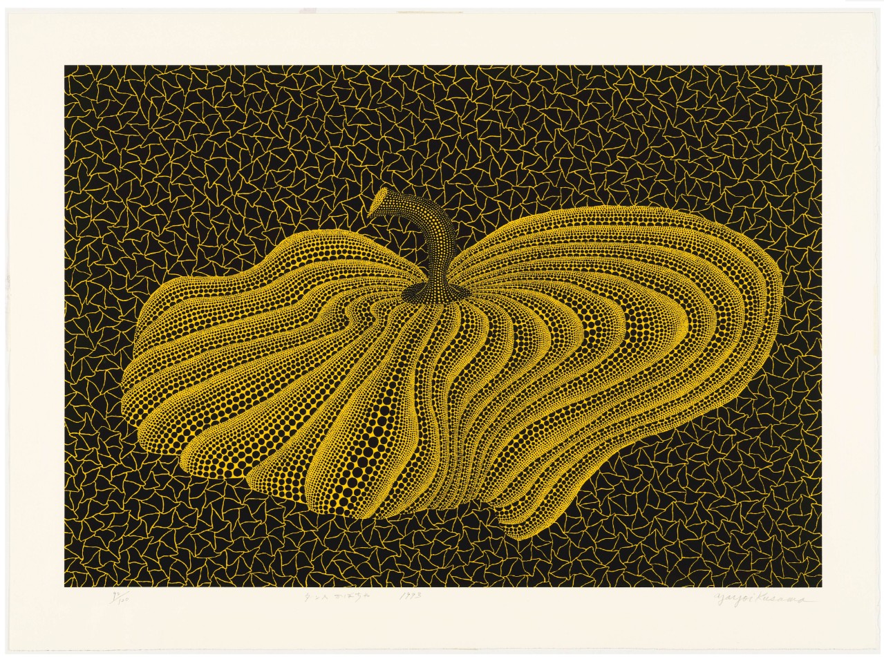 The print is a vibrant composition, typically featuring a pumpkin set against an “infinity net” background, with both the pumpkin and the background covered in Kusama’s signature polka dots. The “YBL” in the title likely refers to a specific color variation, such as Yellow and Black on a background of a different color (as other variants like YOR, BY, GB-D exist). The varying sizes of the dots on the pumpkin’s surface are meticulously arranged to create a sense of volume, curve, and movement, making the two-dimensional object appear three-dimensional.