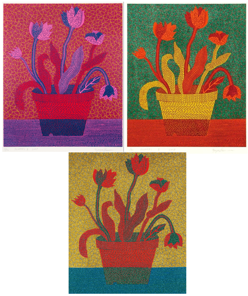 FLOWERS A/B/C depict stylized still-life compositions of flowers, arranged in a flower pot, against a backdrop filled with Kusama’s signature “infinity net” or dot patterns. The colors are vivid but tend towards more “naturalistic hues of red, green and yellow,” presenting a more “playful simplicity” and “grounded” feel compared to her more intense, later works. The flowers are clearly defined but enveloped by the repetitive patterns, which blur the lines between the subject and the background.