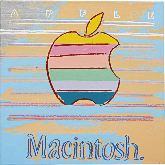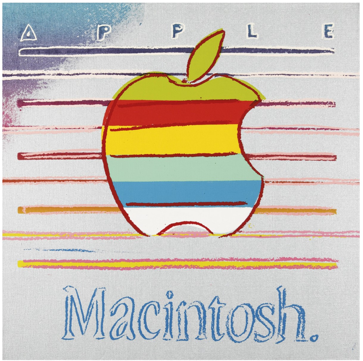 Apple features the multicolored, striped Apple Macintosh logo, rendered against a pastel pink backdrop. Printed on Lenox Museum Board, the logo is framed by the brand’s name, Apple Macintosh, drawing explicit attention to the association between this logo and global consumerism. The vivid colors in this print reflect Warhol’s celebration of American consumer culture and his transformation of the everyday into art, which led to a blurring of the boundaries between high and low culture. Indeed, this print is emblematic of how Warhol turned mass media imagery into art. The bold color in this print, achieved by multiple screens and a layering of paint, is accompanied by gestural lines, delineating the Apple logo.