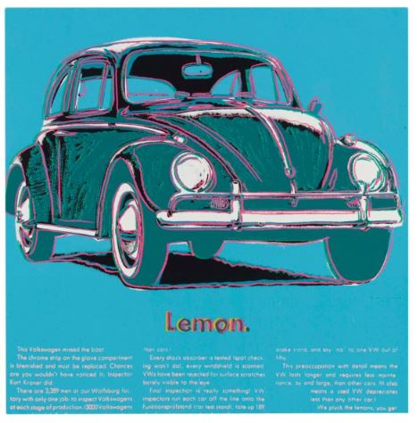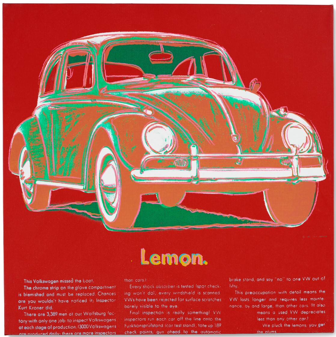 Volkswagen depicts the iconic Volkswagen Beetle advertisement titled “Lemon” from the 1960s. The German car company, seeking to market their vehicles to countless American veterans returning from the war, labeled the image of a perfect Volkswagen model as a ‘Lemon’ or a flawed, cheaply made foreign car. This advertisement proved successful in rebranding their company and showing off the exceptional make of their car through self-deprecating humor. Warhol cleverly uses these defining moments and figures in the history of American consumerism to question what art can be and elevate advertisement to the status of fine art. This print reflects how Warhol wanted his work to target the majority, rather than the affluent minority, through his choice to depict everyday consumer goods. By transforming an everyday object, a Volkswagen Beetle, into art, Warhol deconstructs the boundary between high and low culture. The image also captures Warhol’s ability to identify icons of 20th century popular culture and memorialize them in his work.