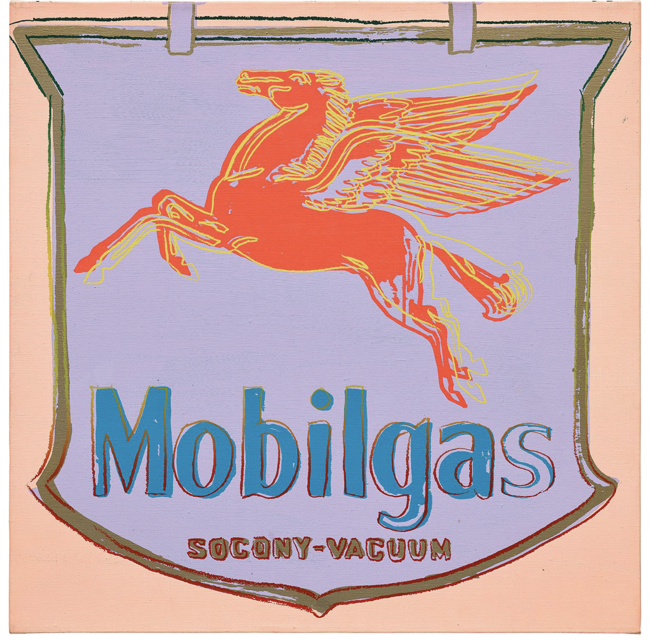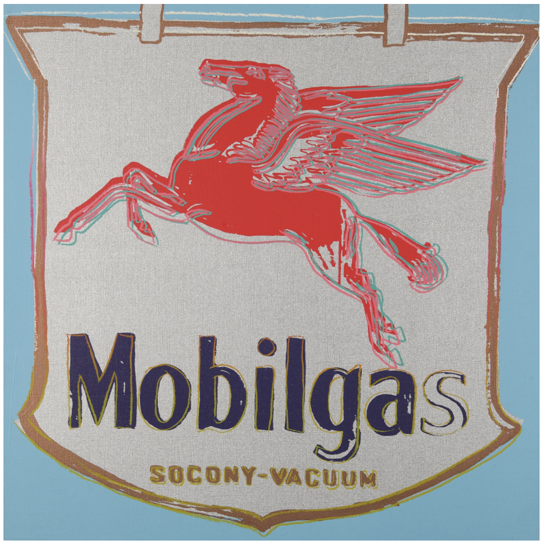 Decades later, the ubiquitous Pegasus – by then one of the most recognized corporate symbols in history – was re-imagined by Andy Warhol as part of his 1985 Ads series. In the standard edition of the Ads series, the Mobilgas Pegasus was printed in its traditional primary red pigment, with electric yellow linework on the logo and Mobilgas name. Yellow gestural lines contrast with the red body of the mythical winged horse, Pegasus, in the center print.The color contrast accentuates the body of the creature originating from Greek mythology, making it the focal point of the print. This technique adds depth to the screen print. While Warhol chose a 1980’s-inspired neon colour palette for this subject, he looked to a vintage iteration of the Mobilgas placard, one of the shield-like metal signs which would have swung in the breeze along Route 66. By taking a piece of Americana and giving it the Warholian twist, the artist looked to both America’s past and future, paving the way for a new generation of creators in the commercial sphere.