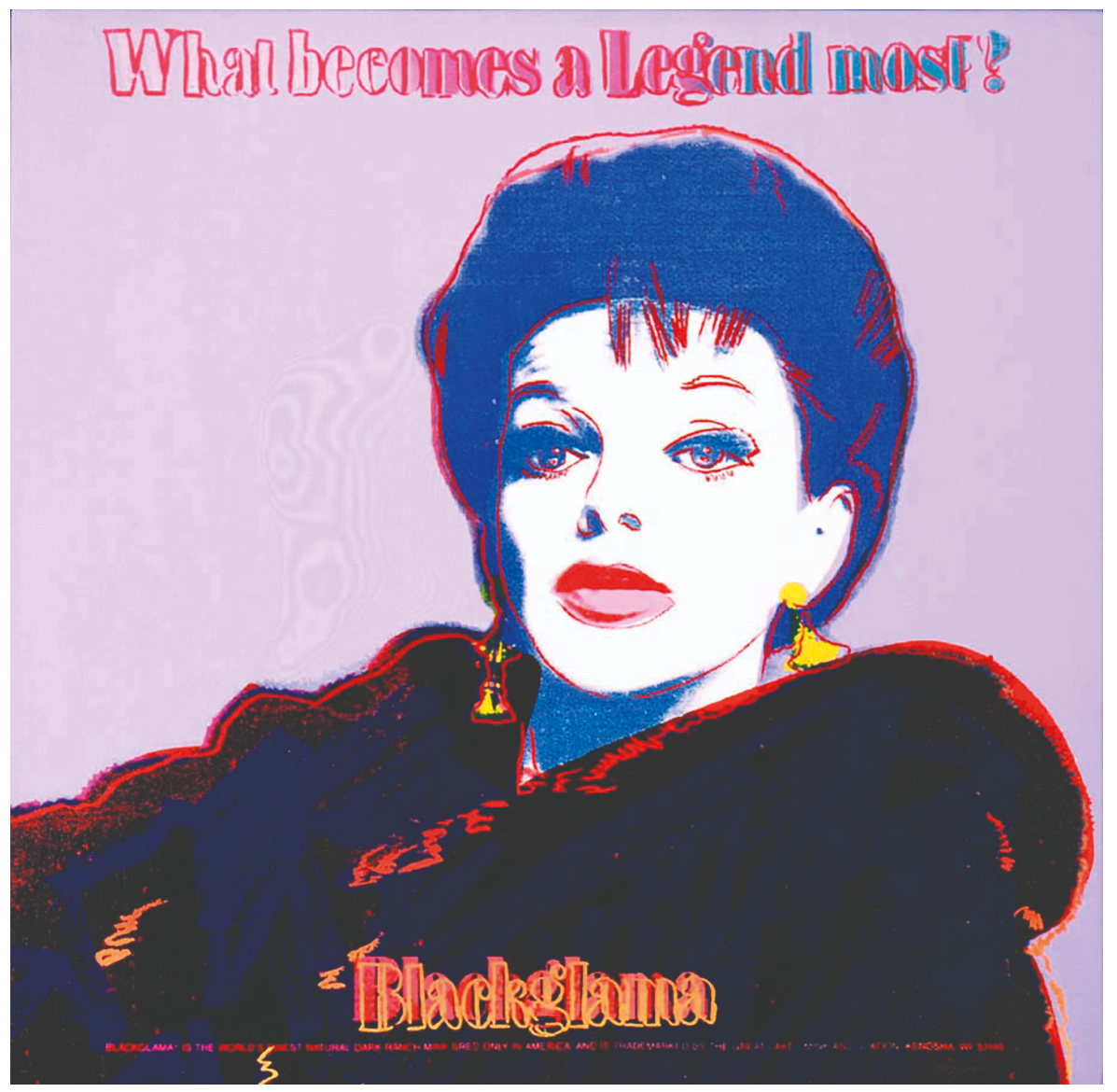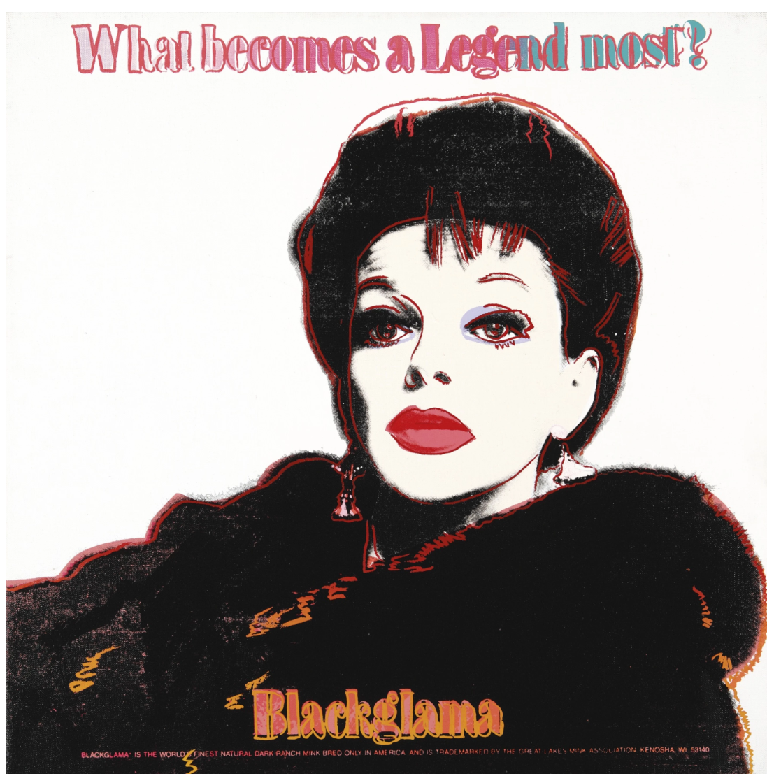 Blackglama depicts famous actress Judy Garland as part of his Ads portfolio. Warhol was inspired by Judy Garland’s advertising campaign for Blackglama Fur company and their ubiquitous tagline “What becomes a Legend most?” Many legends from the fashion world or pop culture have modeled for the company over the years, including Diana Ross, Brigitte Bardot, Lauren Bacall, Julie Andrews, Ray Charles and Marlene Dietrich. Known for her starring role in the 1939 film, The Wizard of Oz, Judy Garland was described by Fred Astaire as “the greatest entertainer who ever lived.” She also had major roles in movies like Meet Me in St. Louis (1945)