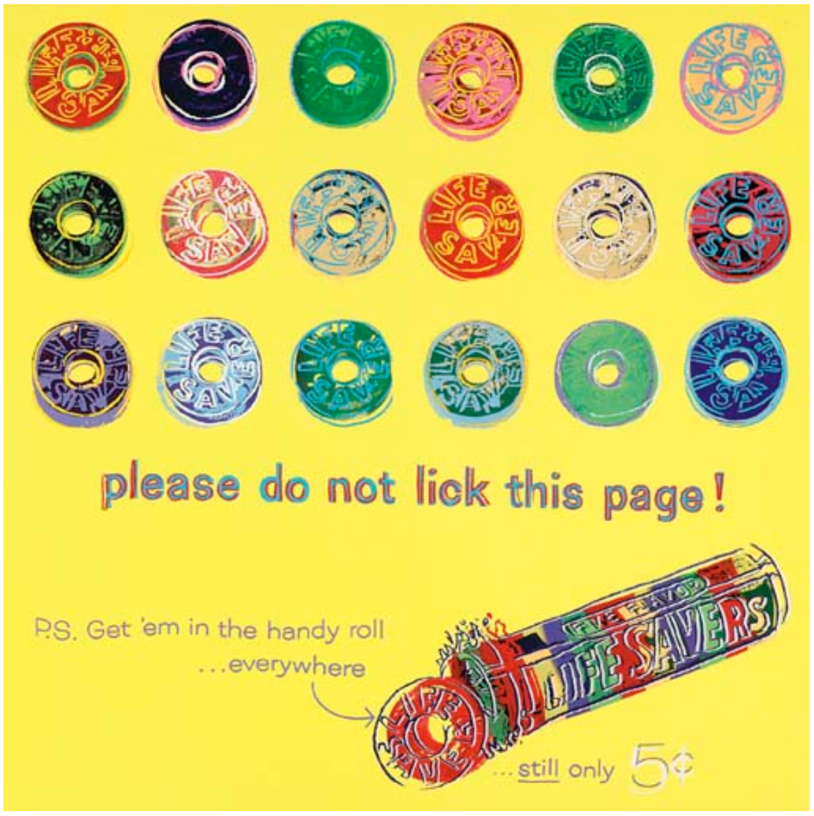 Lifesavers is distinguished by its vibrant, candy-colored decadence, itself a symbol of the succulent temptation of pervasive consumerism. The tempting rows of layered circular sweets printed in an array of pastels and vibrant tones ask to viewer to pick his favorite and lick it. To lick an advertisement is one thing, but to lick a painting, let alone a painting by Andy Warhol, who by this time was as much a known brand as the companies whoso advertisements he coopted in Ads, is sheer lunacy. Further undermining the function of the image, isolating the signifier and by doing so altering the signified, Lifesavers epitomizes the subversive nature of Warhol’s practice, at a time in American history where advertising was king.
