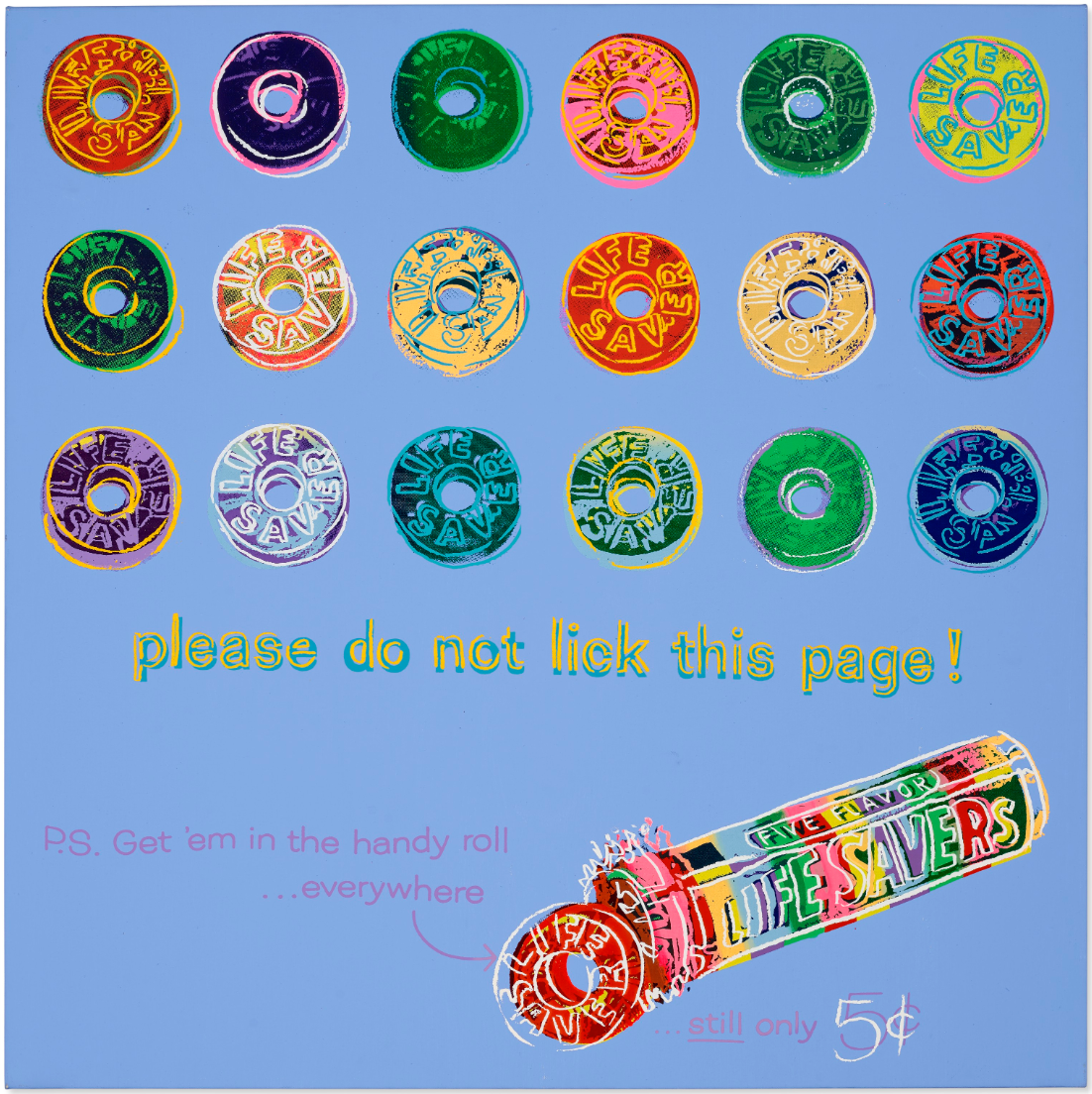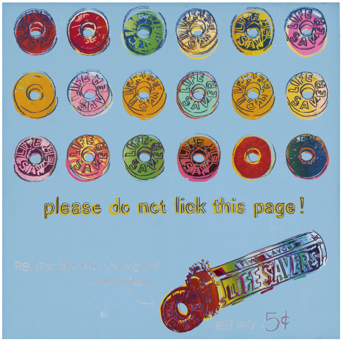 The history of the inconspicuous Life Saver fits perfectly among Warhol’s Campbell’s Soup and Coca-Cola narrative. Known for its distinctive aluminum packaging and iconic ring-shaped candy, Life Savers were first introduced in 1912. The hard candies were invented to offer a sweet alternative to chocolates which often melted in the summer heat. While Life Savers have gone through many iterations—from flavors such as anise, clove, and lavender—the iconic fruit flavors were developed in 1921. A staple candy for many Americans, during the second World War many other candy manufacturers donated their sugar rations to keep Life Savers in production so that they could be shared with the Armed Forces stationed abroad as a sweet reminder of life at home. Warhol’s lasting idea that a coke could be enjoyed by anyone no matter what their status in life, rings perfectly true for the donut shaped candies.