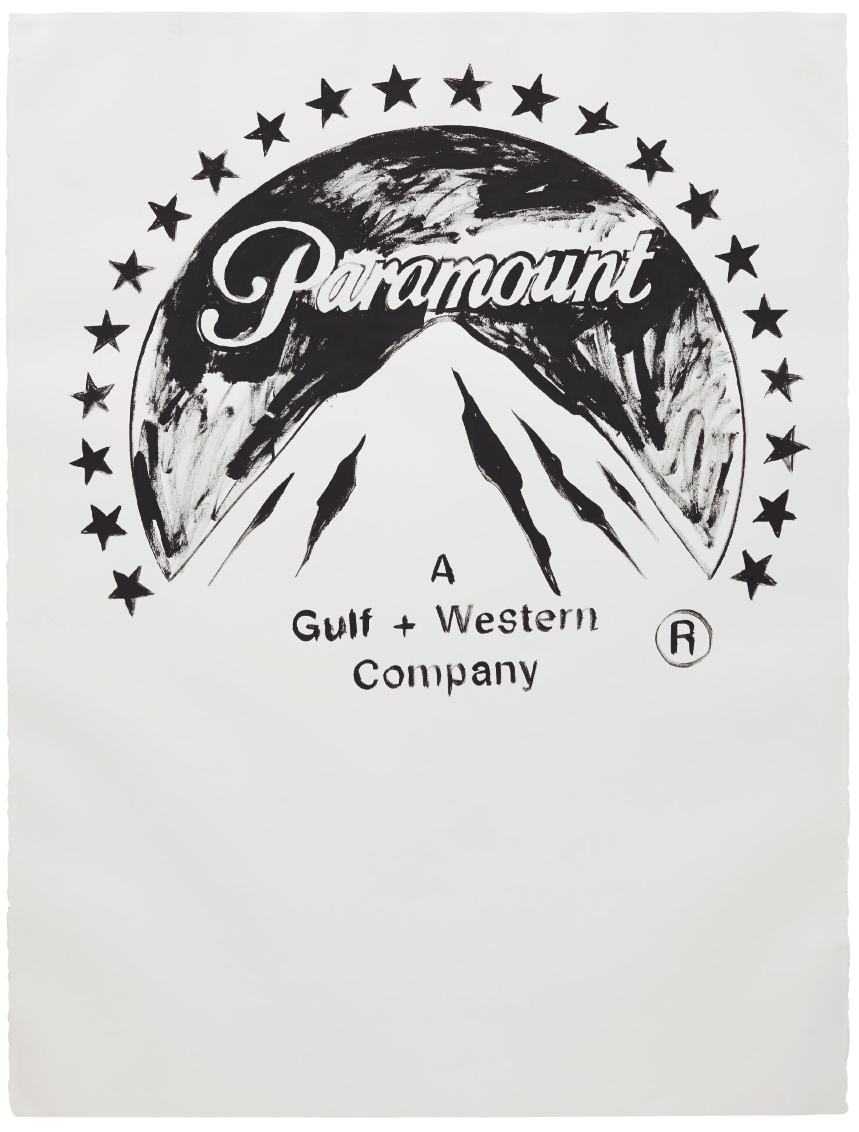 Paramount is a colorful screen print that captures the well-known logo of the American film studio, Paramount Pictures. Warhol depicts the logo’s iconic mountaintop, rendered in white against a tricolored backdrop of pink, red and blue. The circular logo in the middle of the print is surrounded by an arch of stars in yellow and green. These vivid and unlikely colors contrast with the print’s white background. Warhol’s use of color and gestural lines works to vivify the mountain and its surrounding text. The production company’s name, Paramount, stands out, which reflects Warhol’s keen interest in American popular culture and mass media production.