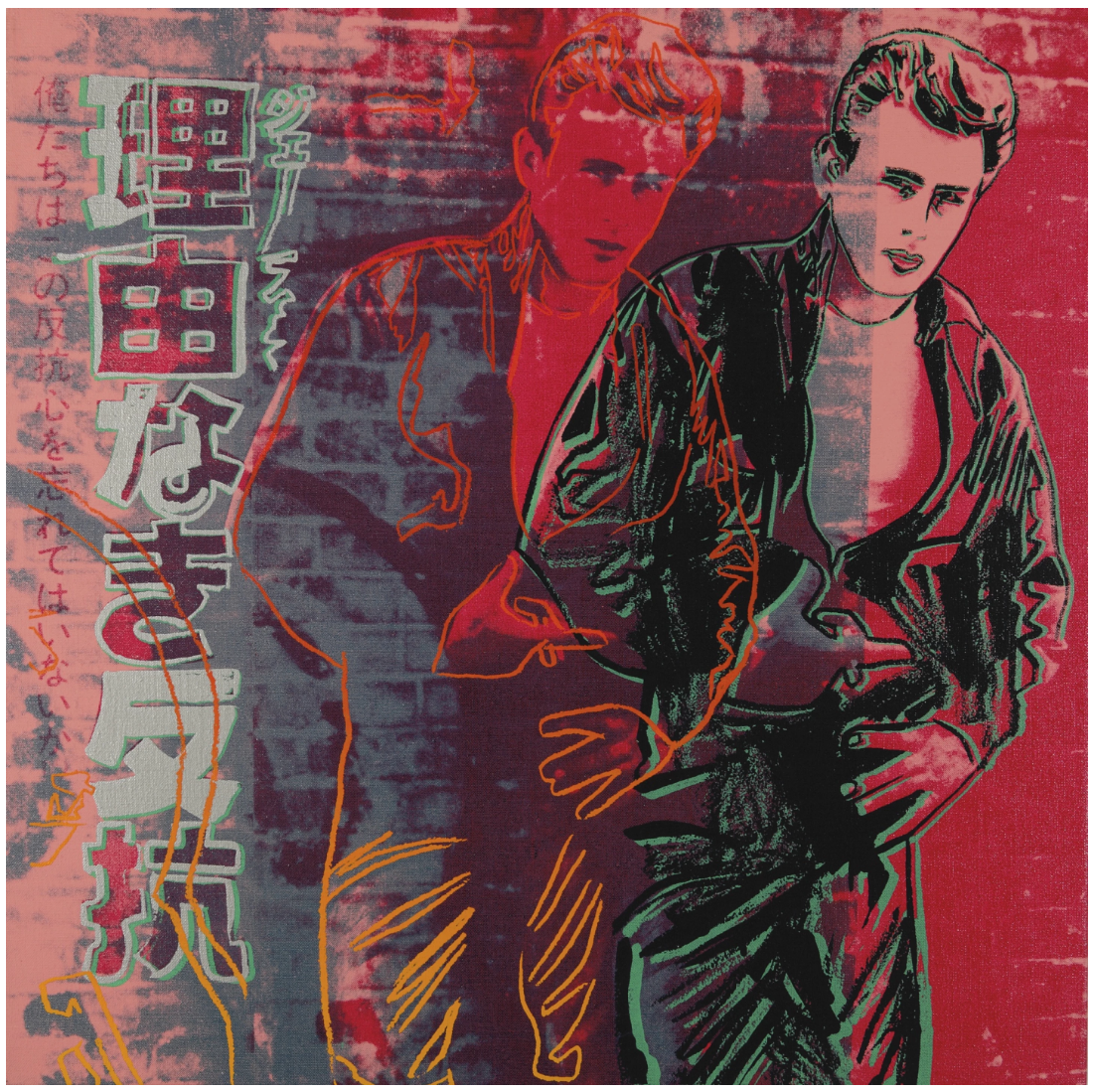 Drawn to the youthful and famous, Warhol immortalizes them in this series, which also includes Judy Garland, and Ronald Reagan. What is present, too, in Rebel Without a Cause (James Dean) is a note of imminent disaster. There is an outlined shadow figure of Dean, leading one to see the young actor as transient or fading from view—the effect is ghostly. This commentary on death and the question of permanence is particularly resonant, as it brings forth that though Warhol was entranced by the concept of celebrity, he was not unaware of the painful truths of untimely death—in fact, perhaps his fascination with Dean is rooted in this painful loss, and Rebel Without a Cause (James Dean) ultimately immortalizes the memory of Dean as a tragic, teenage idol who embodies the promise and disappointment of Hollywood.