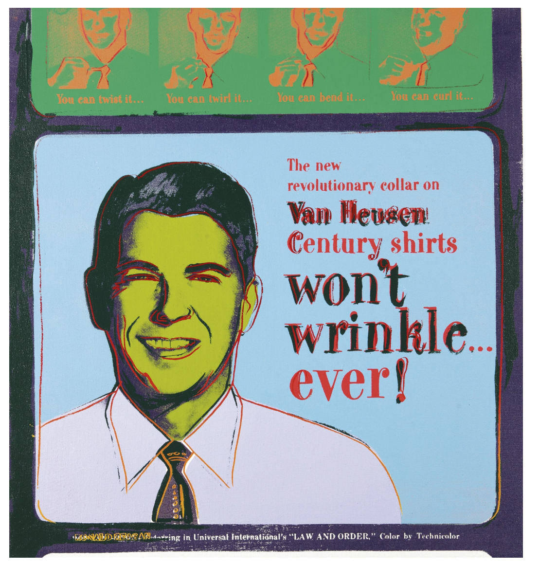 Van Heusen (Ronald Reagan) reflects Warhol’s keen interest in consumer culture. Indeed, the image source of this print is an advert Ronald Reagan did for Van Heusen shirts in 1953.
