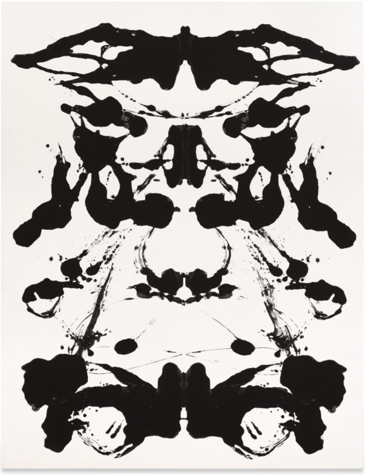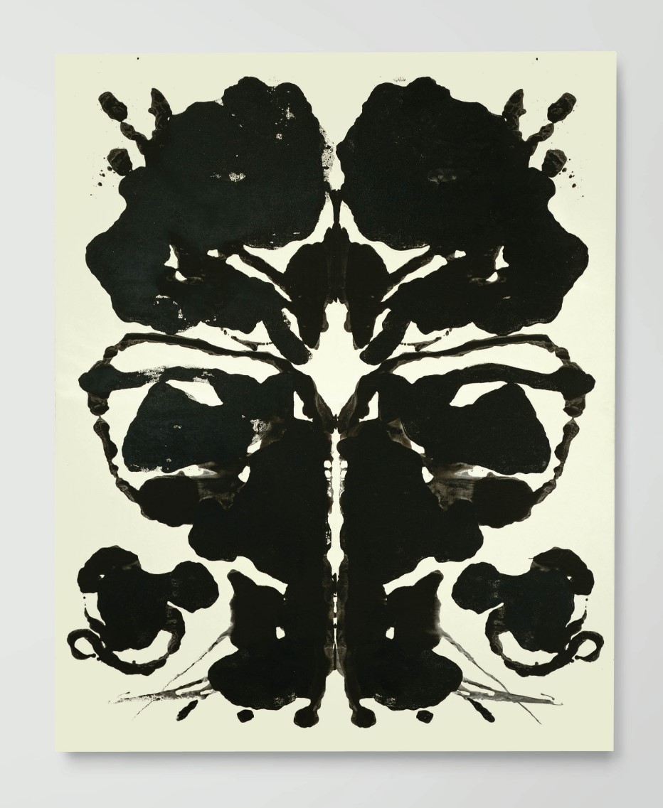 In the present work, the latticework of shadowy black paint unfurls in a pictorial marriage of fluidity and abstraction that indexes this chance method of splattering and compressing, dripping and dragging paint across an open field of creamy white. Divided into symmetrical quadrants, Rorschach reveals the resulting mirrored image that emanates from the center point in silhouettes of black paint, viscous and opaque in certain areas, feathery and light in others. Imprecise and unpredictable, the totemic forms remain open to any form of interpretation, reminiscent of an inkblot test that creates enigmatic imagery onto which the viewer can project their own desires and fantasies.